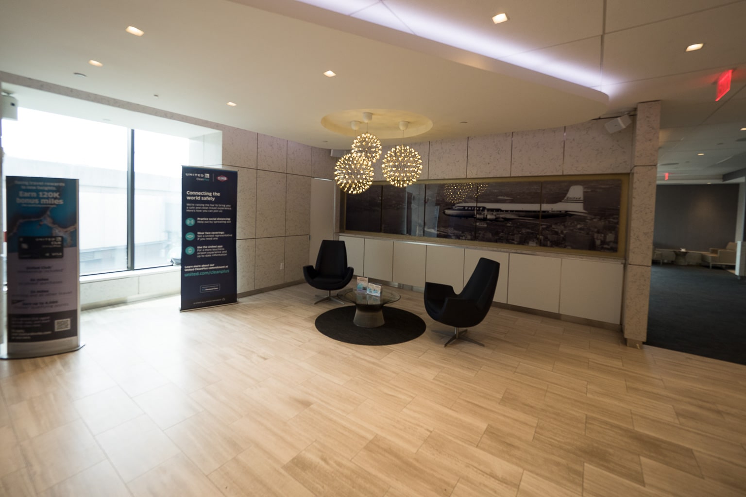 In the foyer, there’s a small sitting table beneath a photograph of a United aircraft from many decades ago. The space features cream, tan, and light grey tones, a palette you’ll notice throughout the bright lounge.