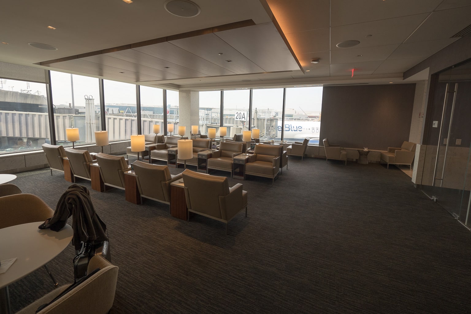 As you enter, on your left there’s an area entirely with lounge seating. The majority of the seats are individual armchairs, with end tables featuring lamps and multiple types of power outlets in between.