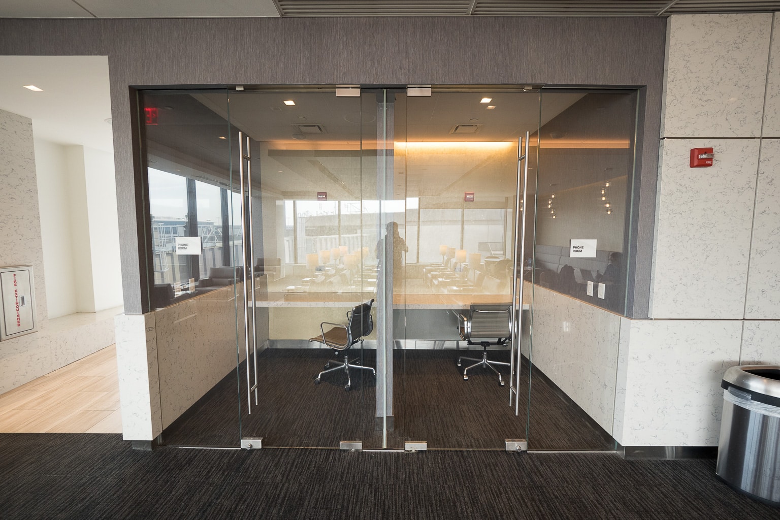 To your right, there are two phone booths with floor-to-ceiling glass doors, where you can make calls with a bit of acoustic privacy. Each room has an empty desk and a swivel chair.