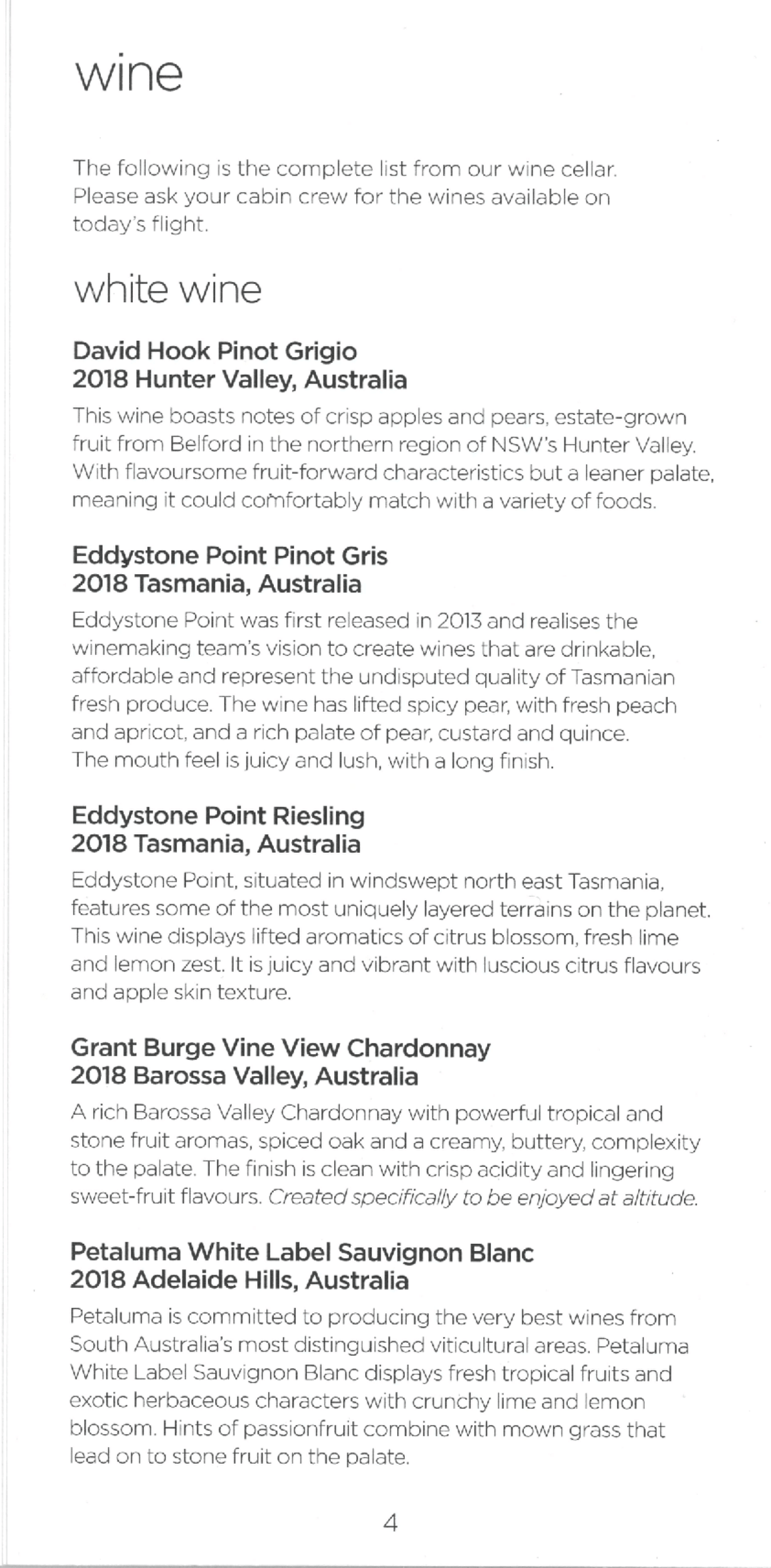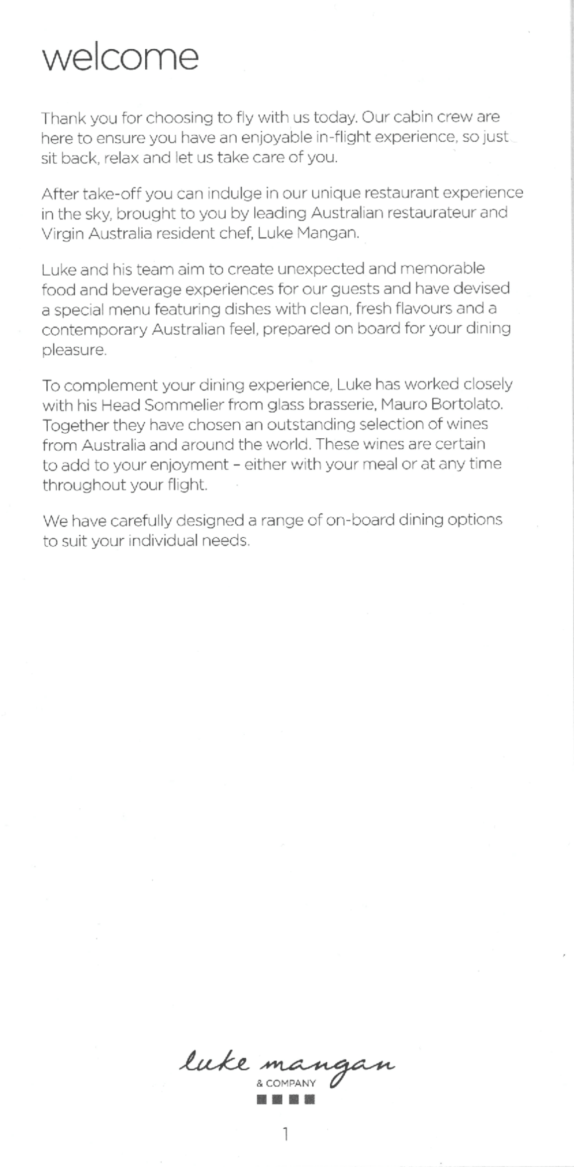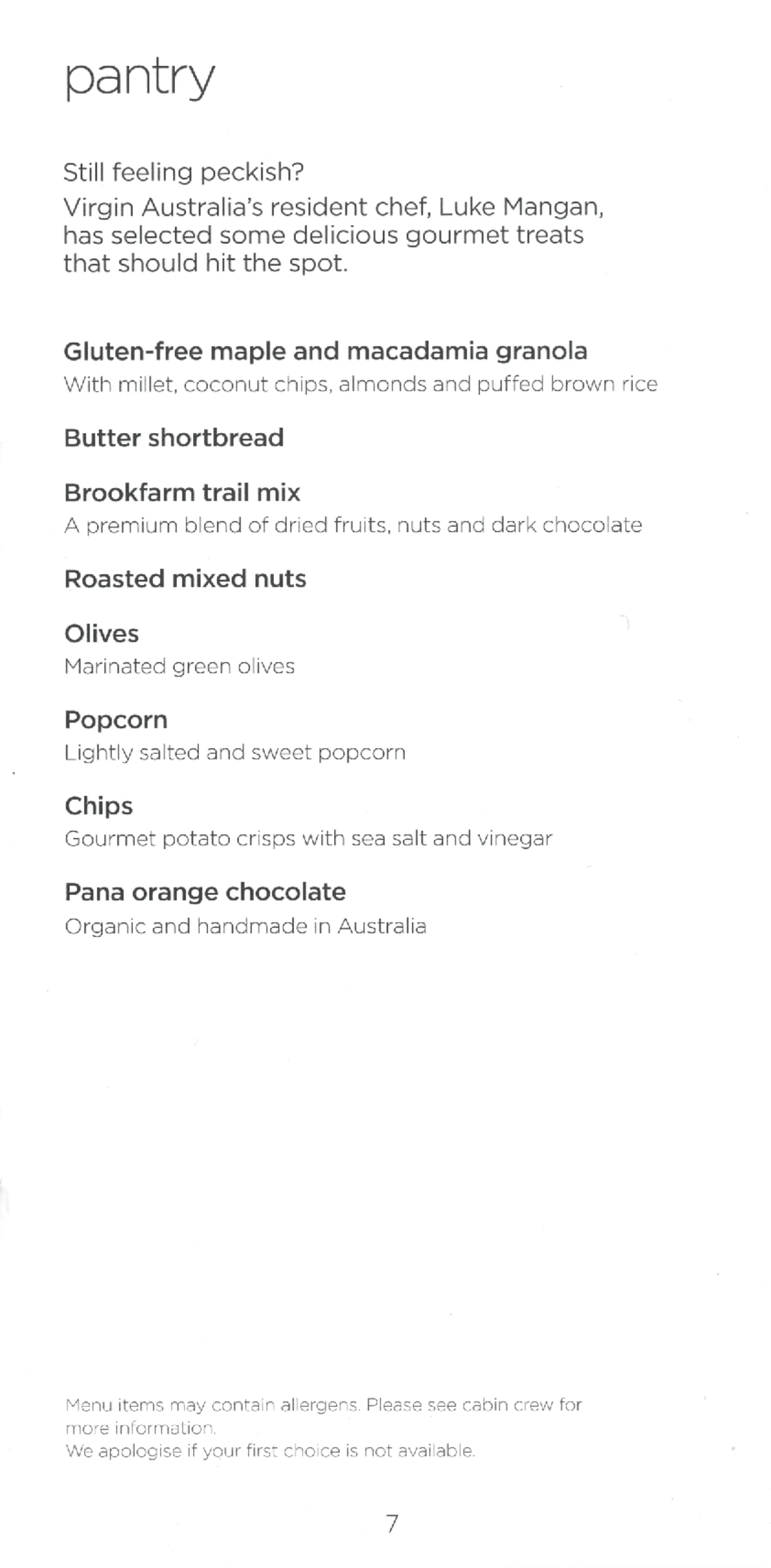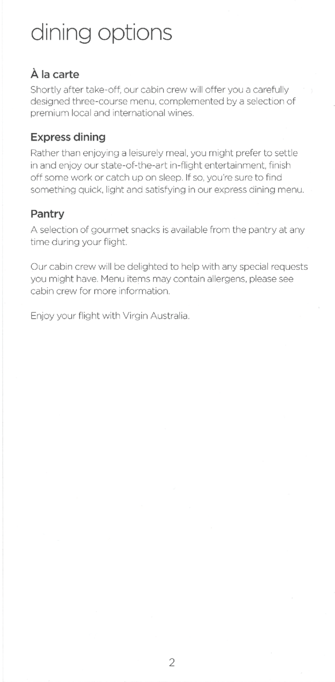 Virgin Australia business class – Menu