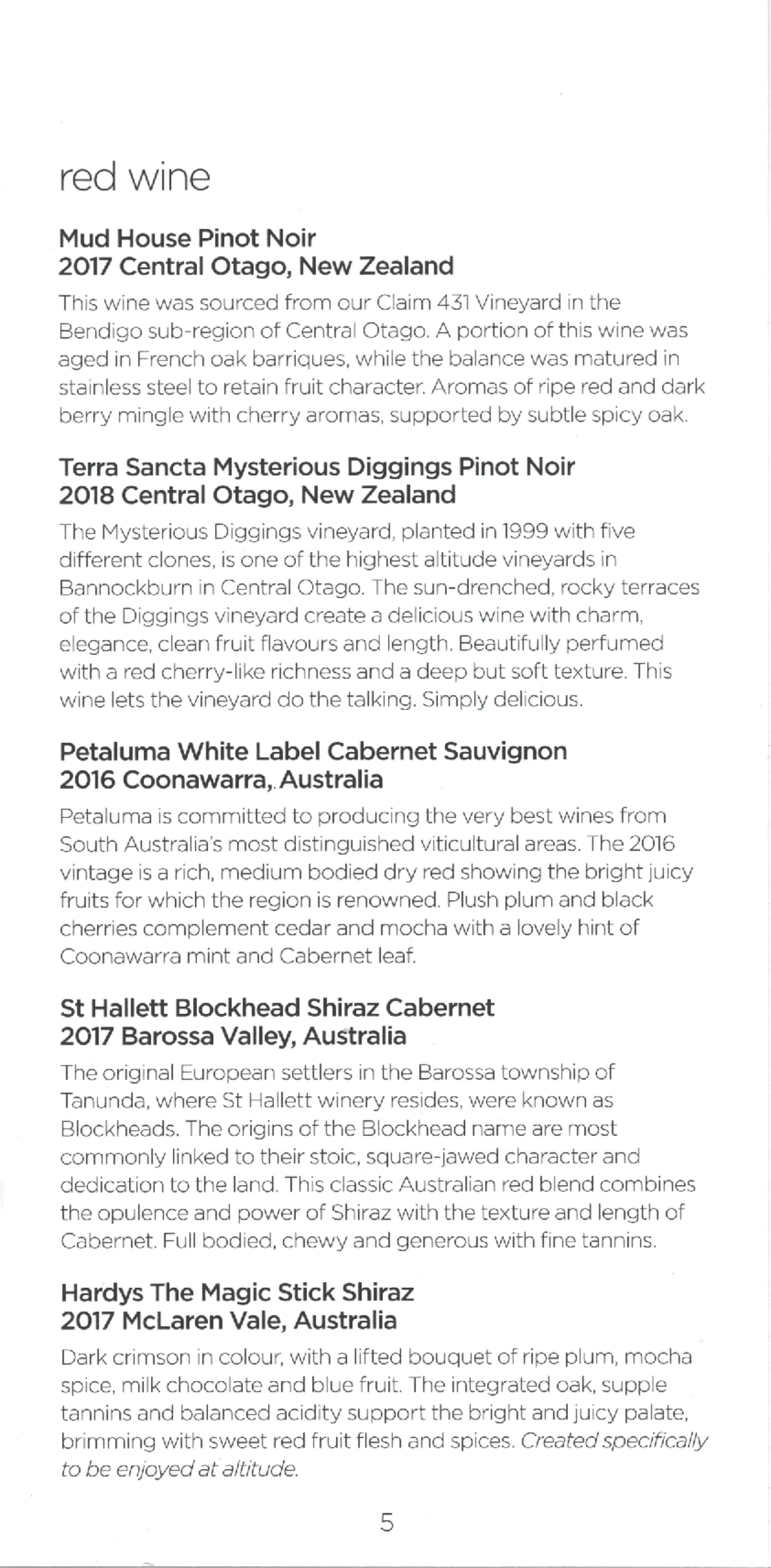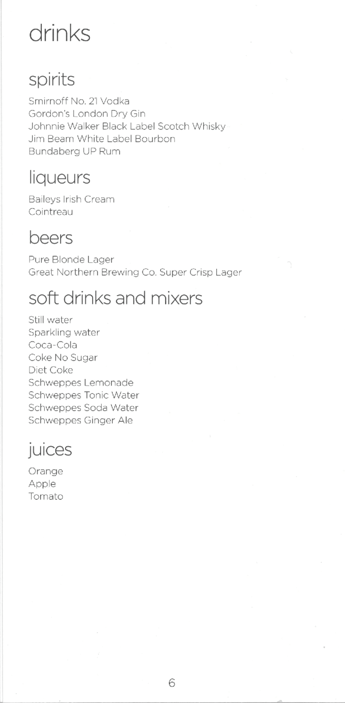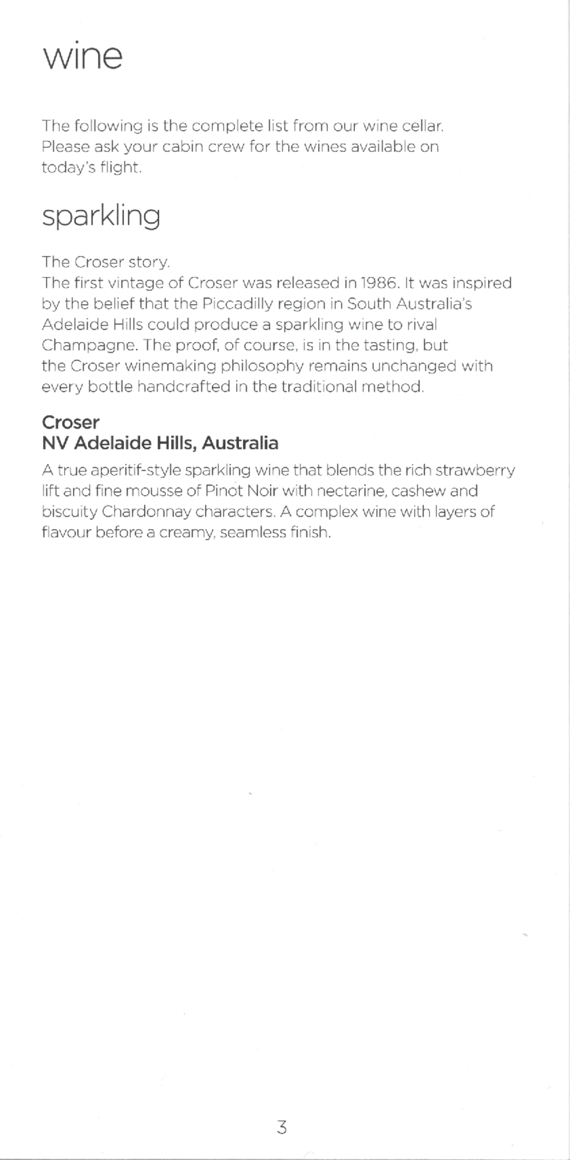 The main pamphlet, which listed the wine, beverages, and snacks, read as follows: