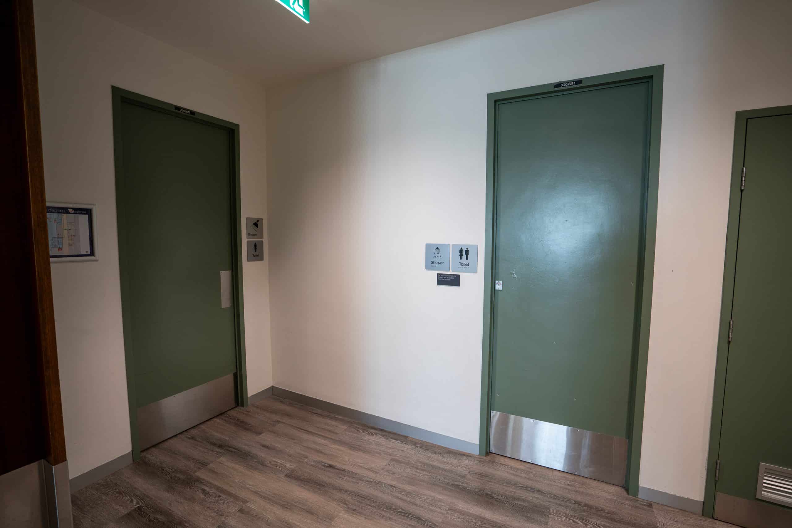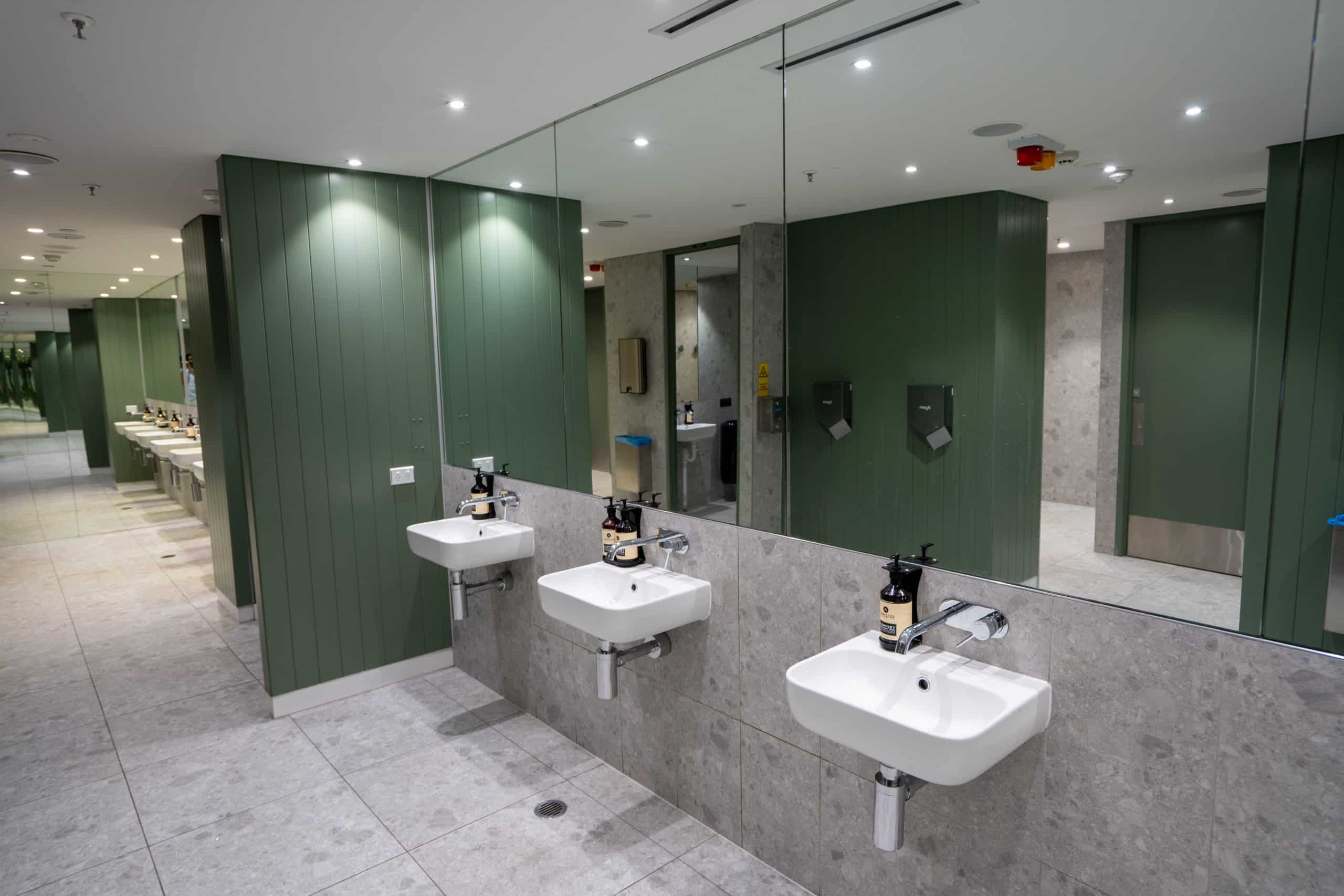 Meandering further into the middle of the lounge, you’ll stumble upon the bathrooms. Characterized by muted green hues and speckled grey tiling, these emanate an air of sophistication within the lounge.