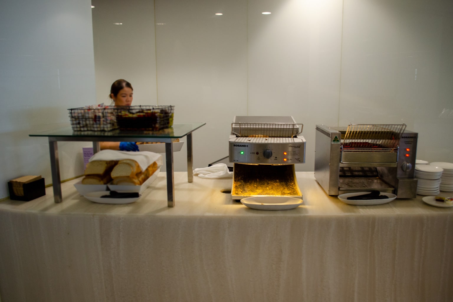 The dining area is located in the heart of the lounge. A single counter takes up the majority of the space, and there’s a separate island with bread nearby.