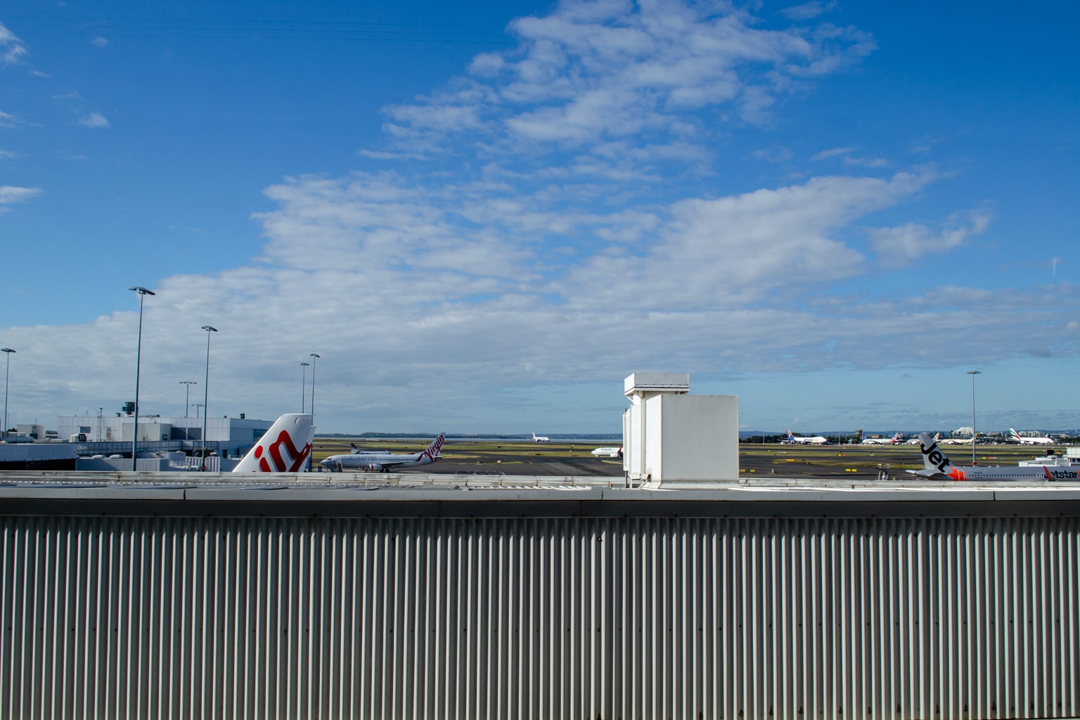 The views from this area are obstructed, but in the distance you can see planes taxiing between the runway and the gates.