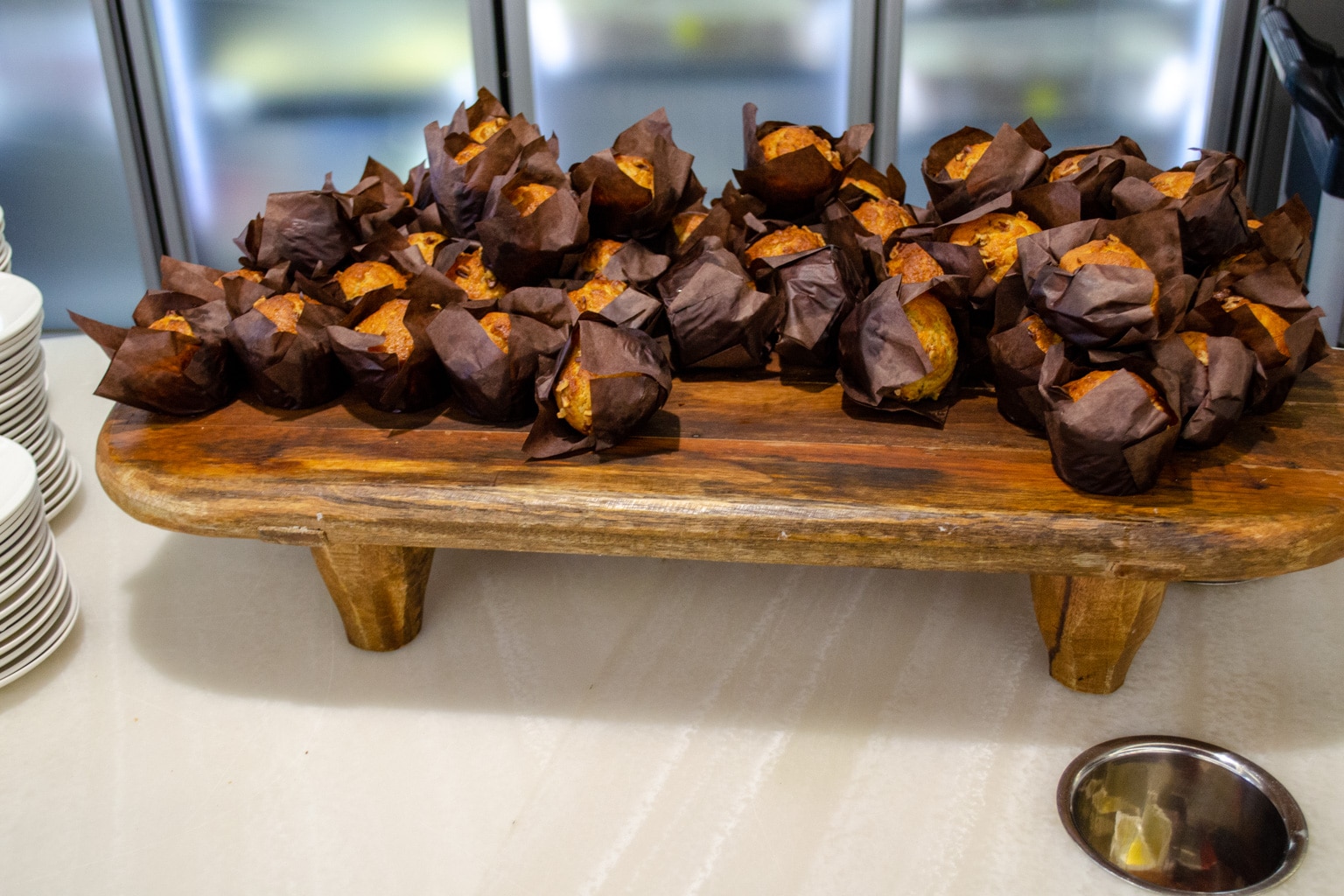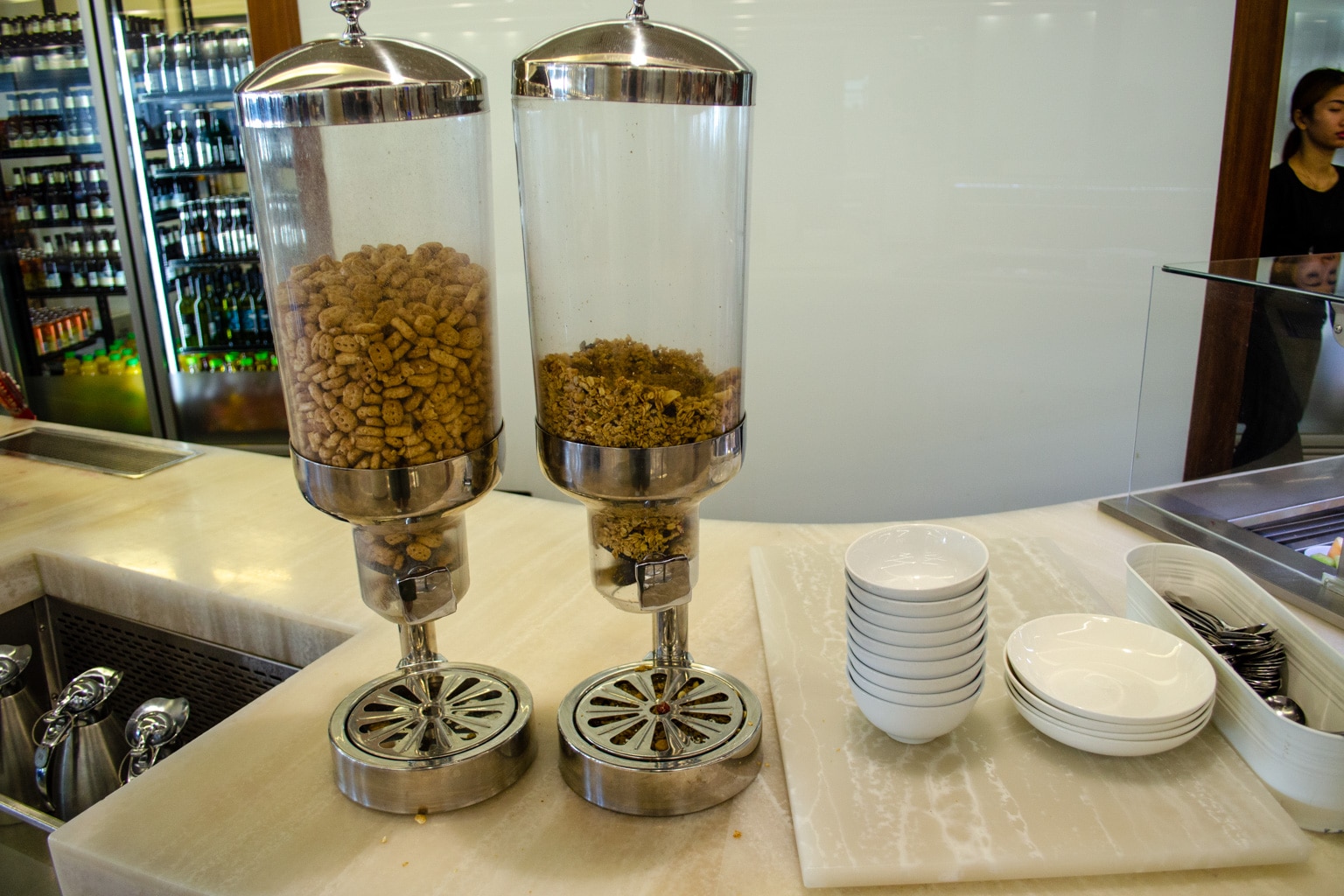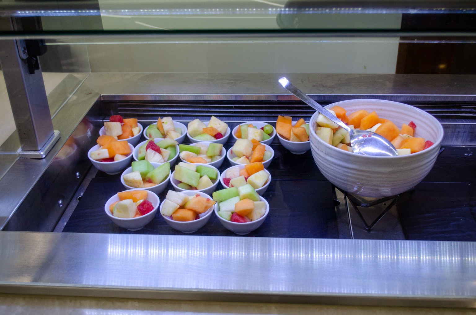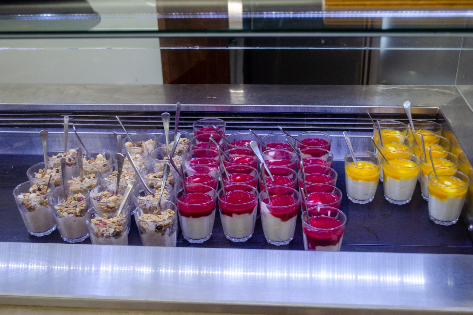 The cold buffet selection had more items available, including cereal, muesli, fruit salad, a selection of yogurts with passionfruit, raspberry, and granola toppings, and some muffins.