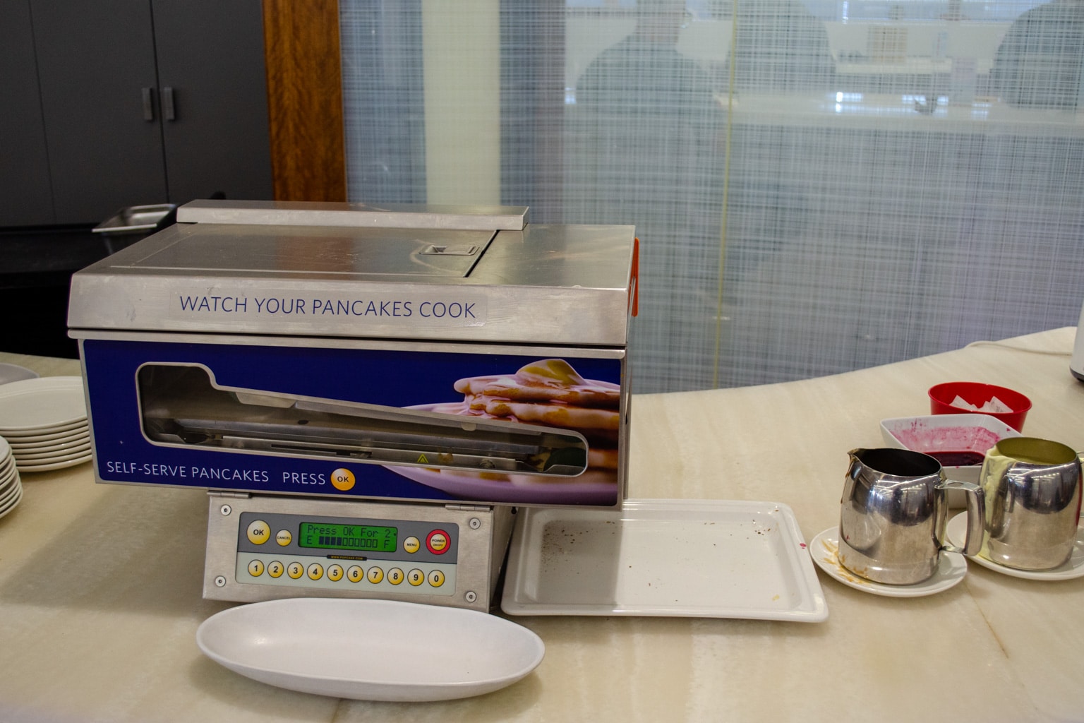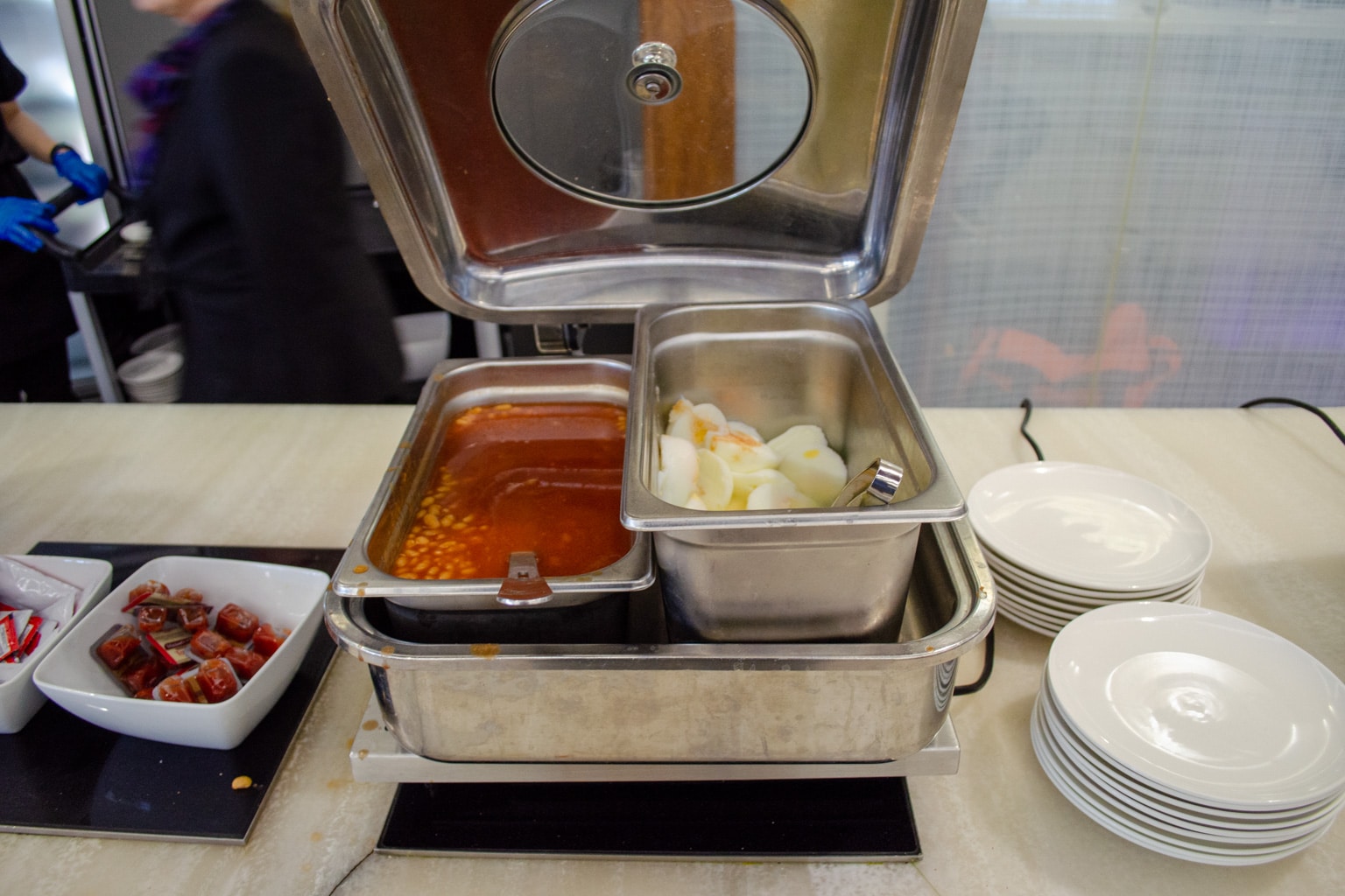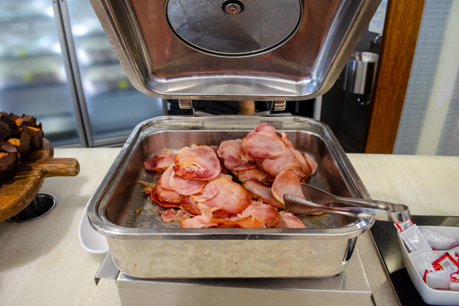 Hot items included streaky bacon, baked beans, and poached eggs, as well as a pancake machine and a station where you can toast bread.