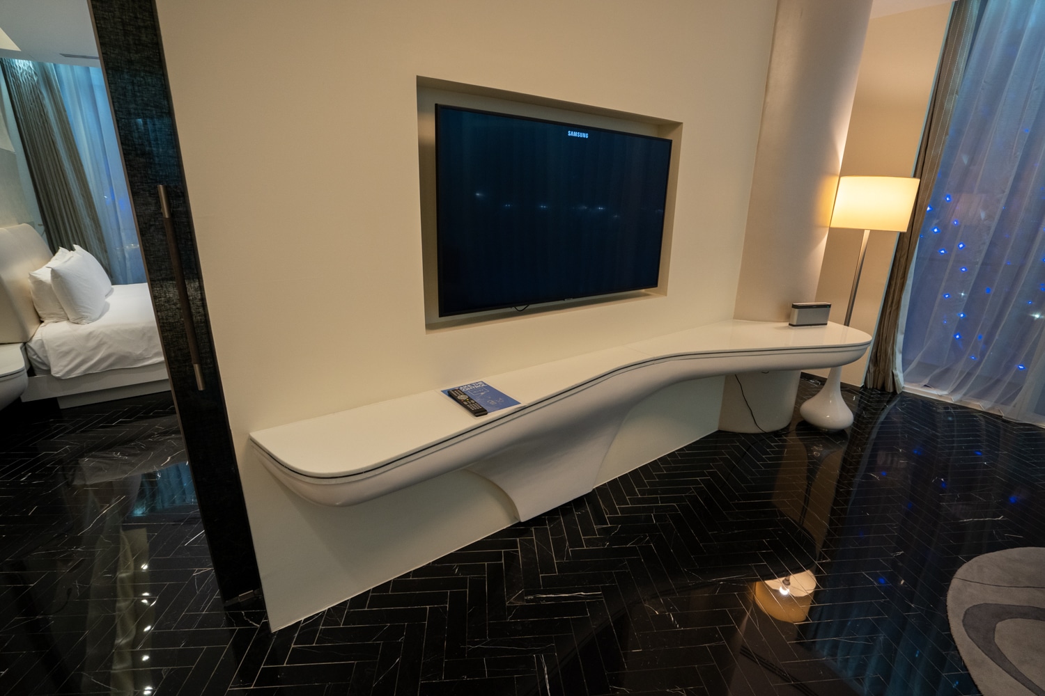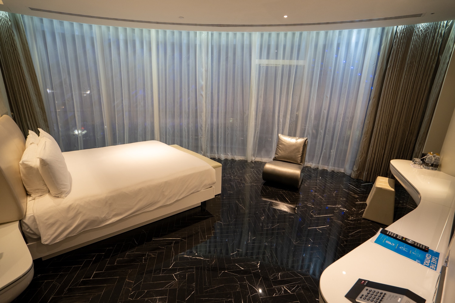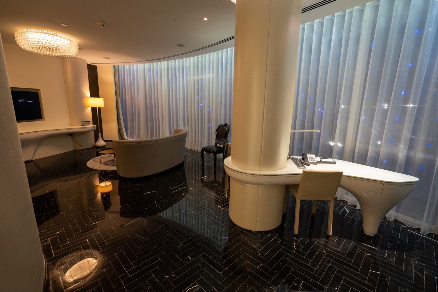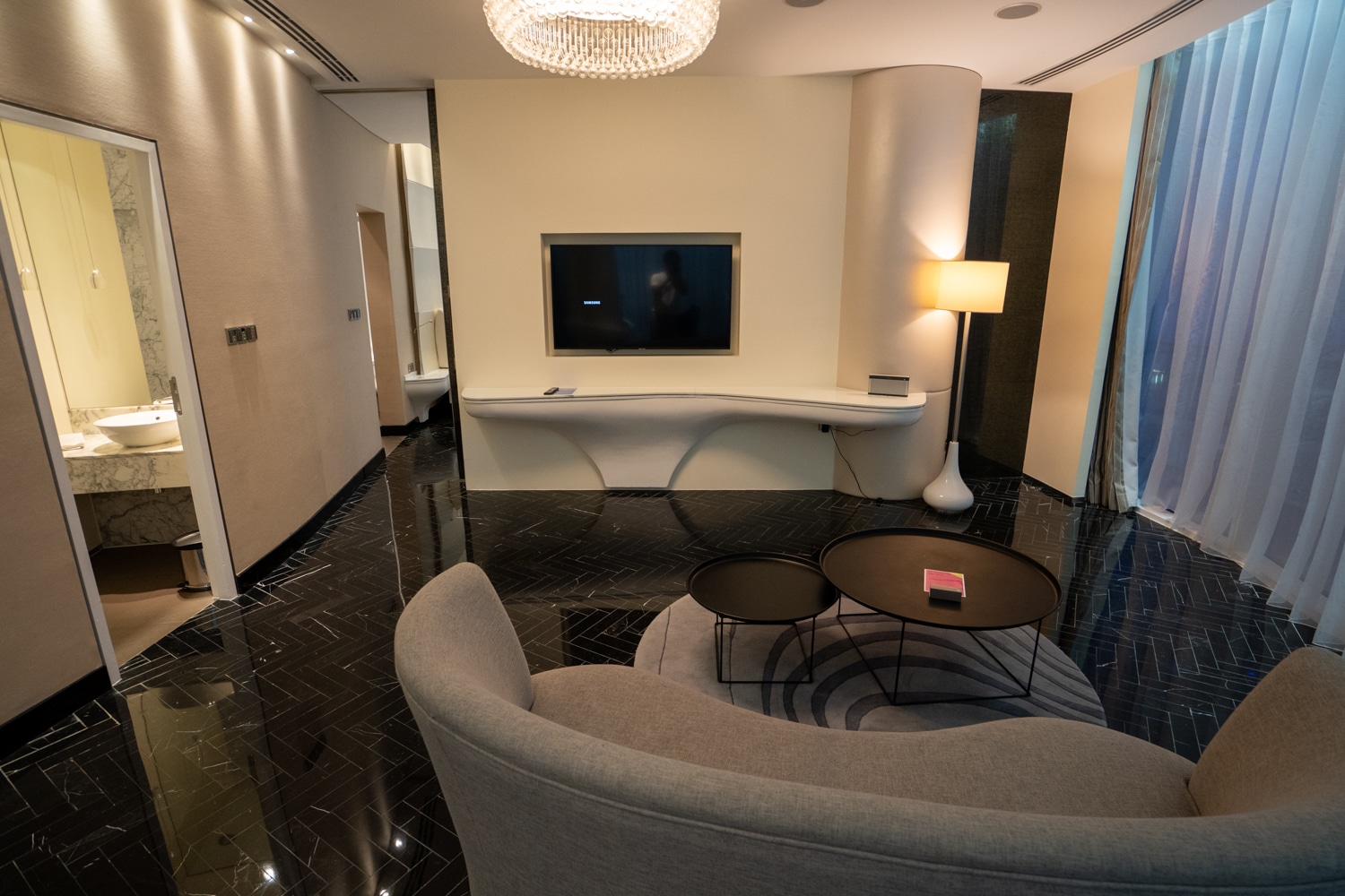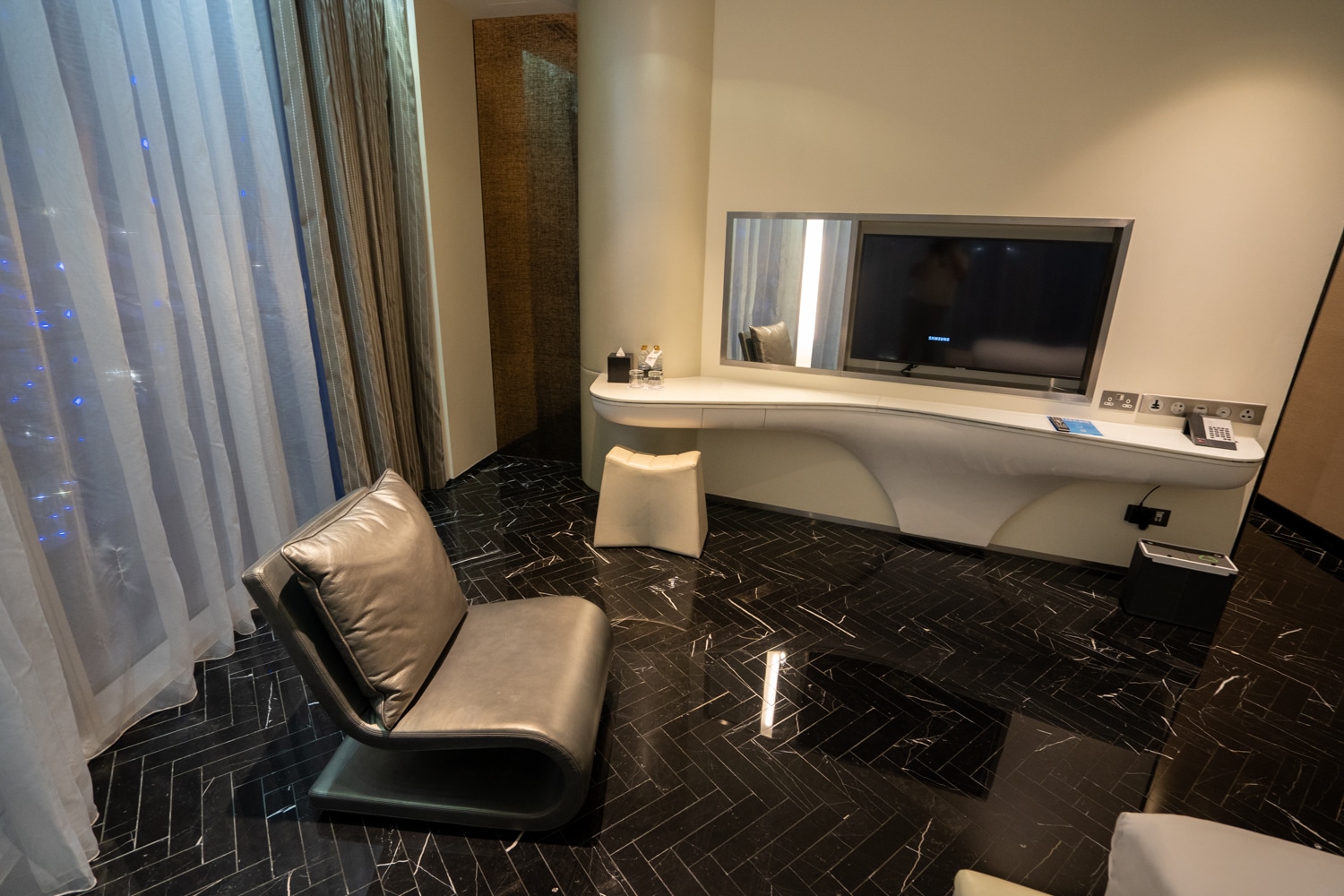 Upon entering the suite, I was greeted by the same futuristic style of the hotel’s exterior. The furnishings and design were minimalistic, with sleek jet-black flooring contrasted by light upholstered furnishings.