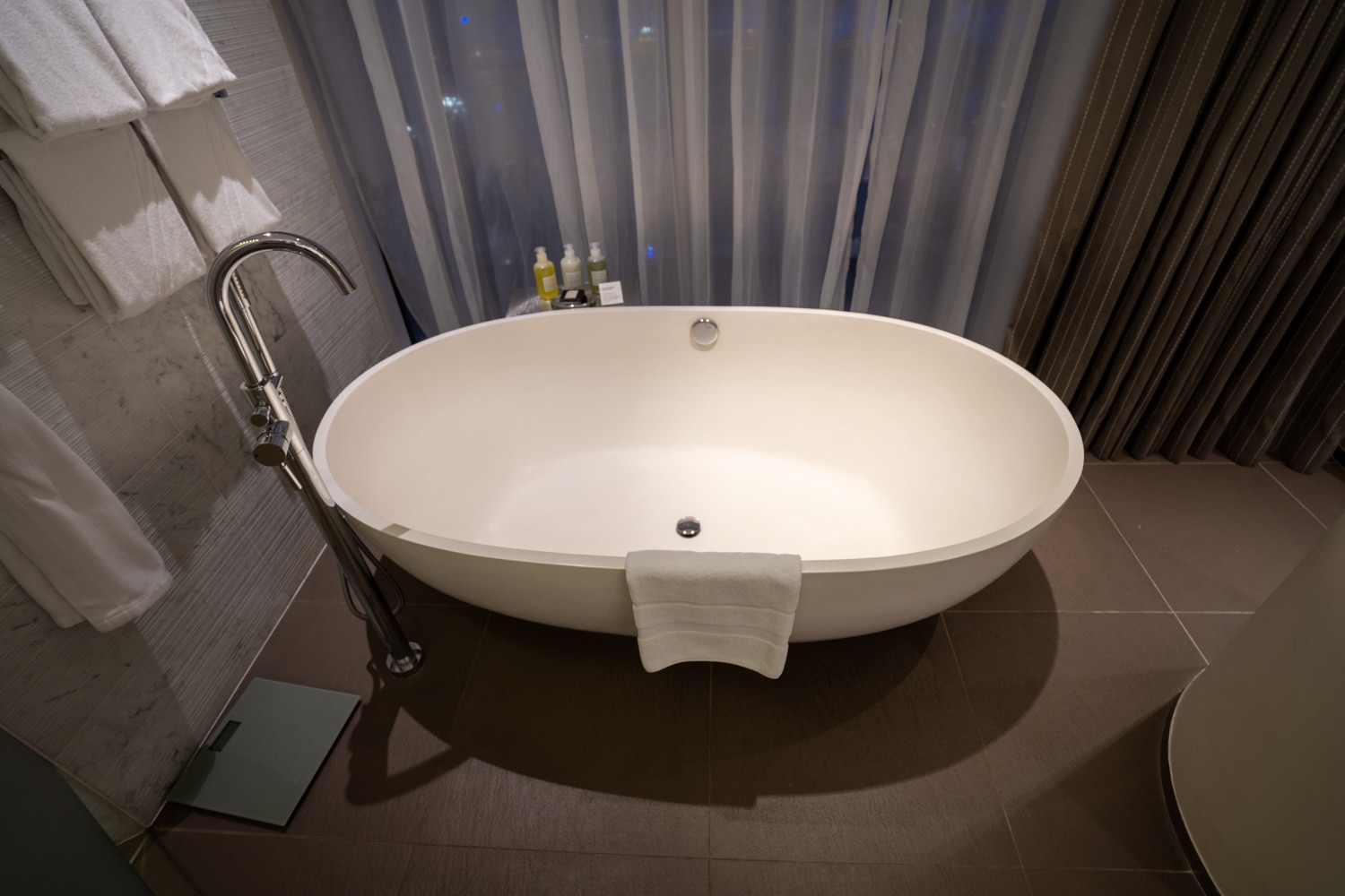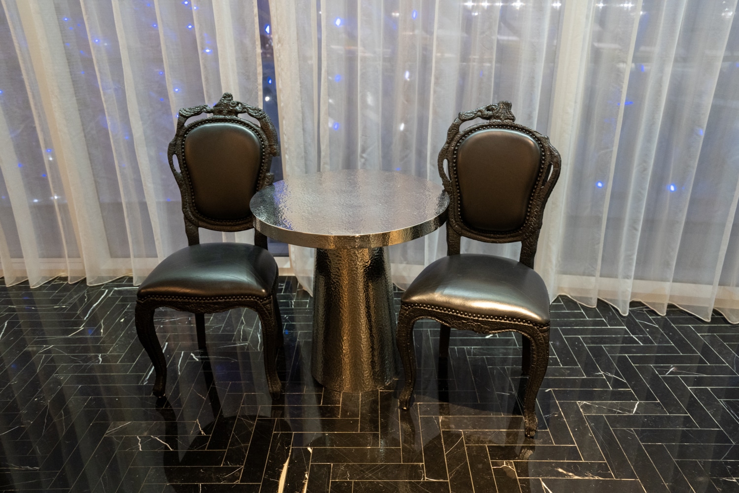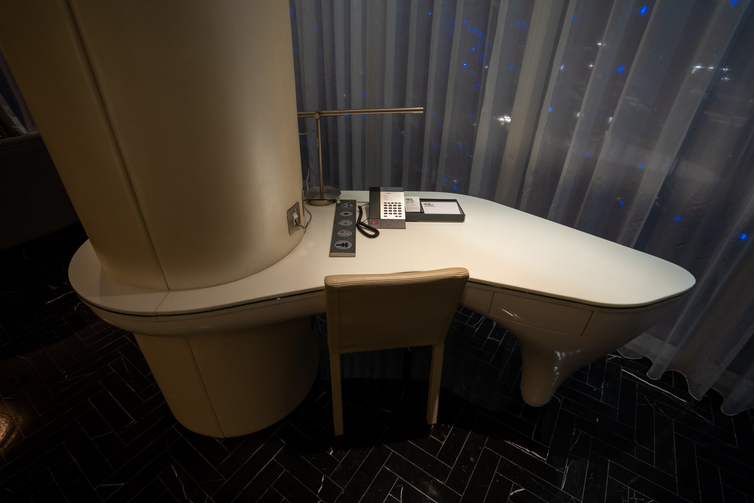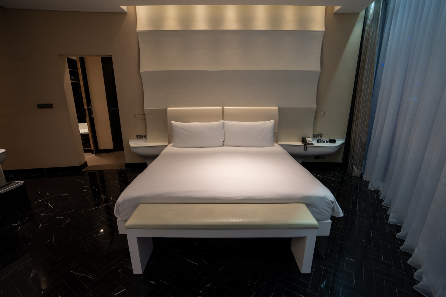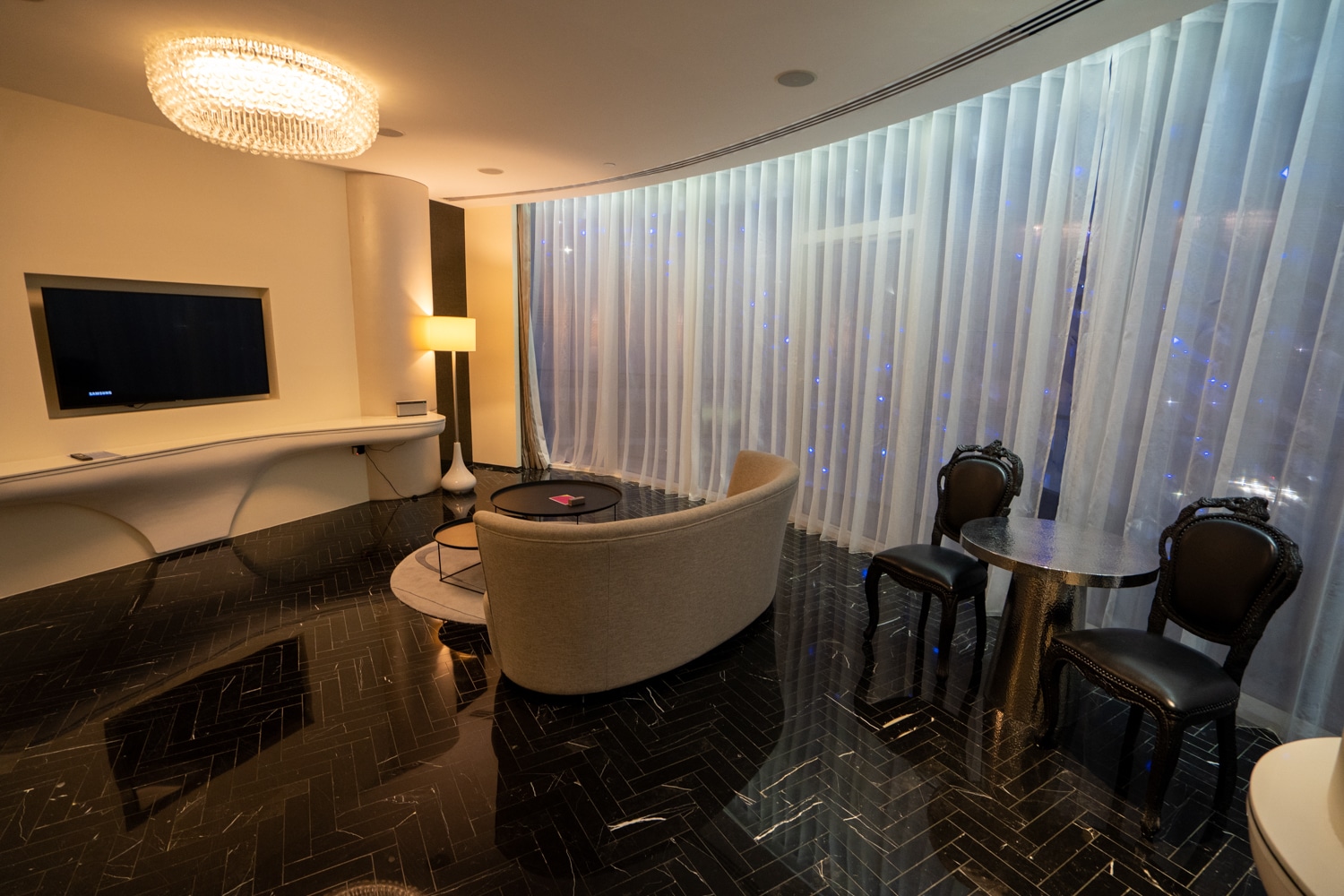 Upon entering the suite, I was greeted by the same futuristic style of the hotel’s exterior. The furnishings and design were minimalistic, with sleek jet-black flooring contrasted by light upholstered furnishings.