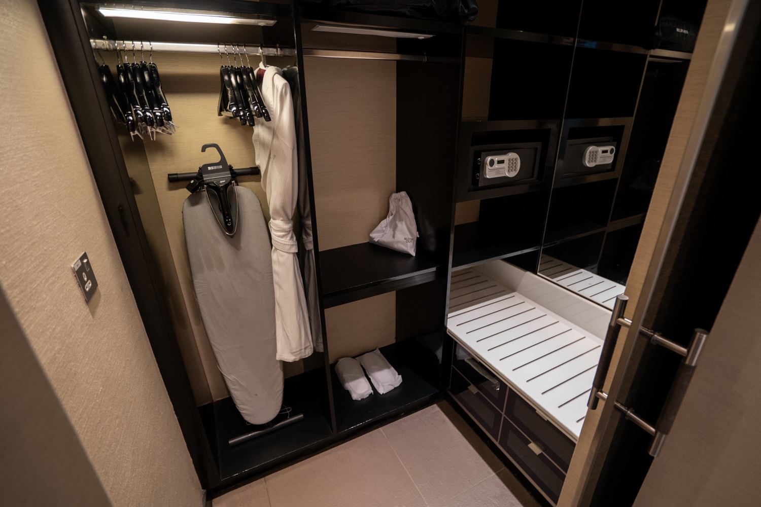 Drawing our attention back to the suite, there’s a spacious walk-in closet with ample storage space, complete with a plush robe and slippers.