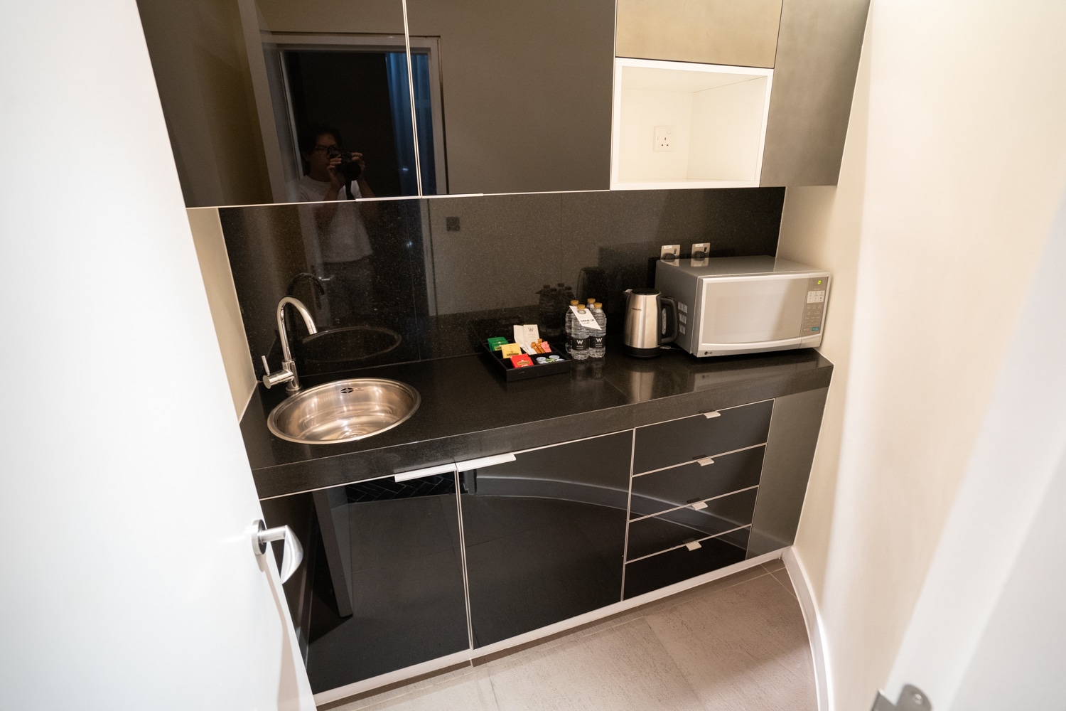 Immediately to the left at the suite’s entrance is a compact kitchenette with a microwave, sink, electric kettle, and well-stocked cabinets.