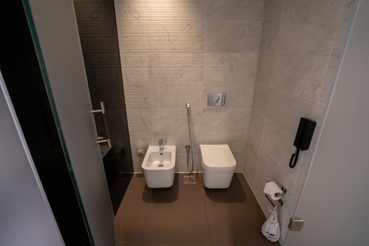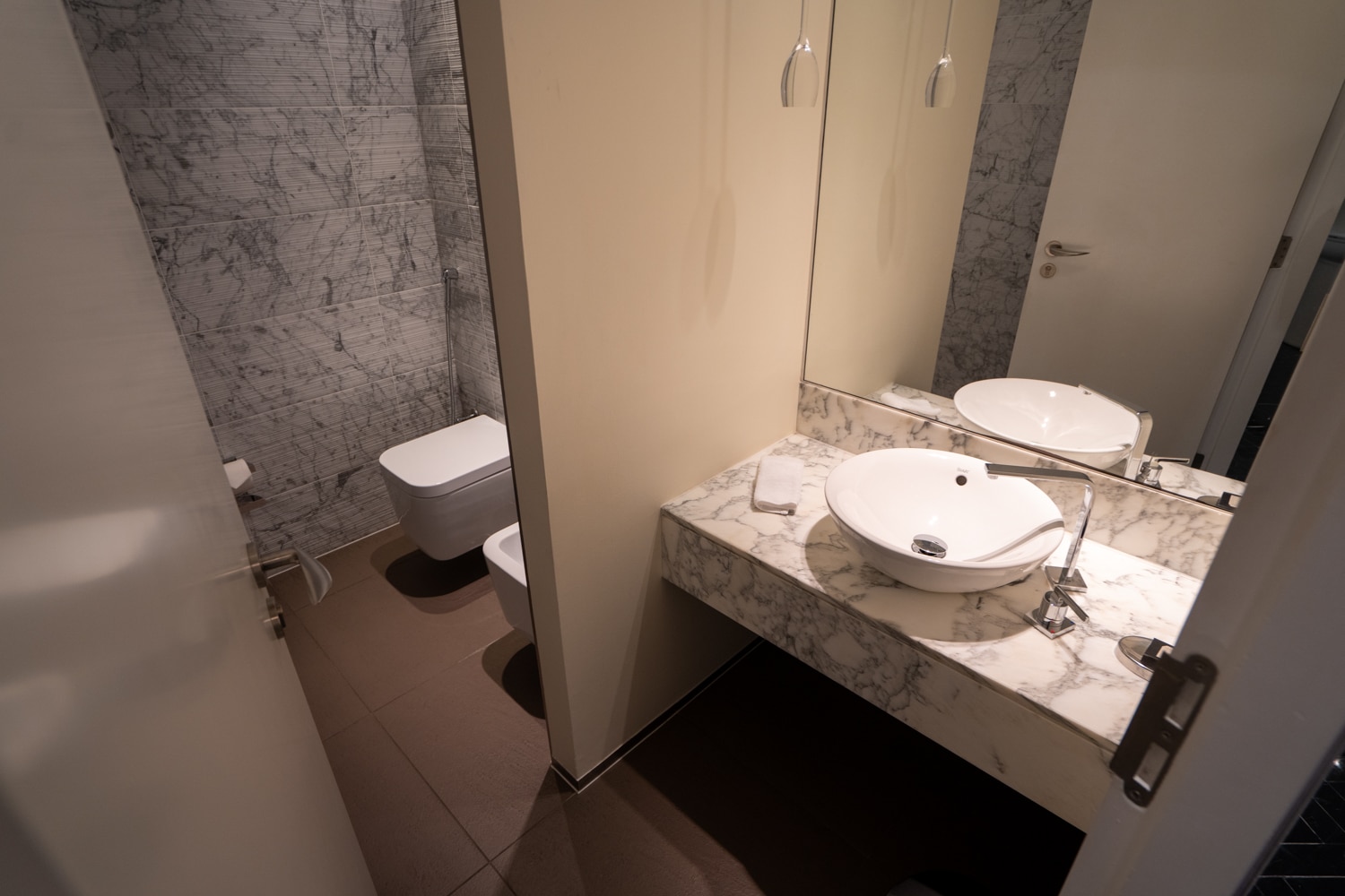 The suite features a small half-bathroom with a marble vanity and a stylish vessel sink. A regular toilet and bidet are discreetly housed behind a half wall for added privacy.