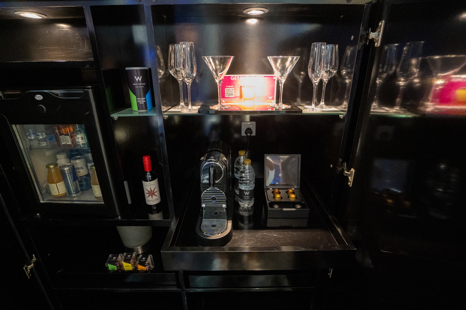 To the right of the desk is the pantry equipped with a Nespresso coffee maker and a minibar with light snacks, as well as alcoholic and soft drinks in the mini-fridge.