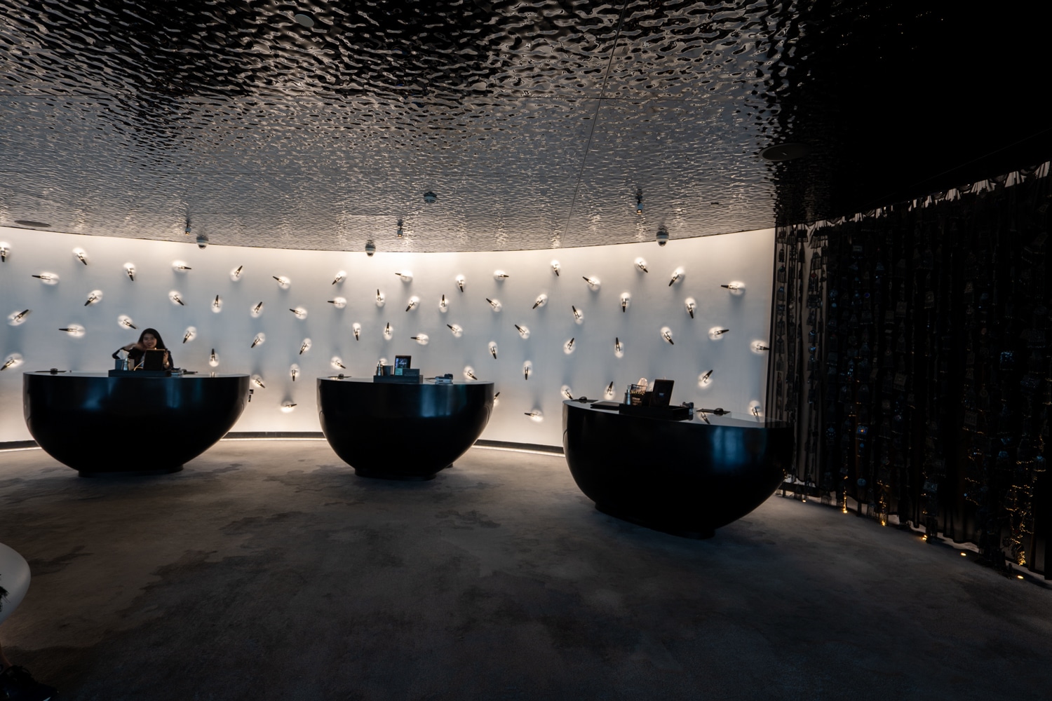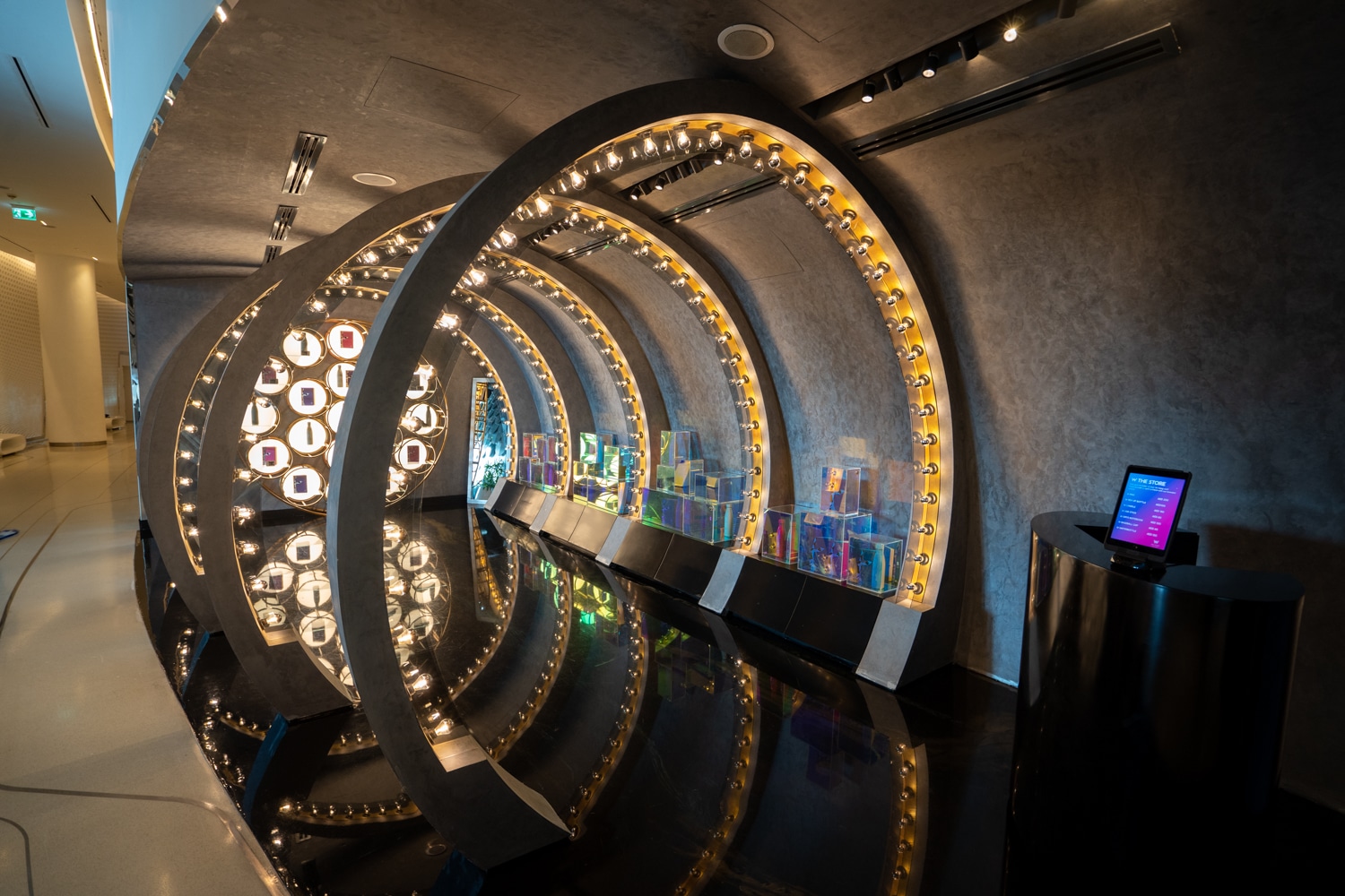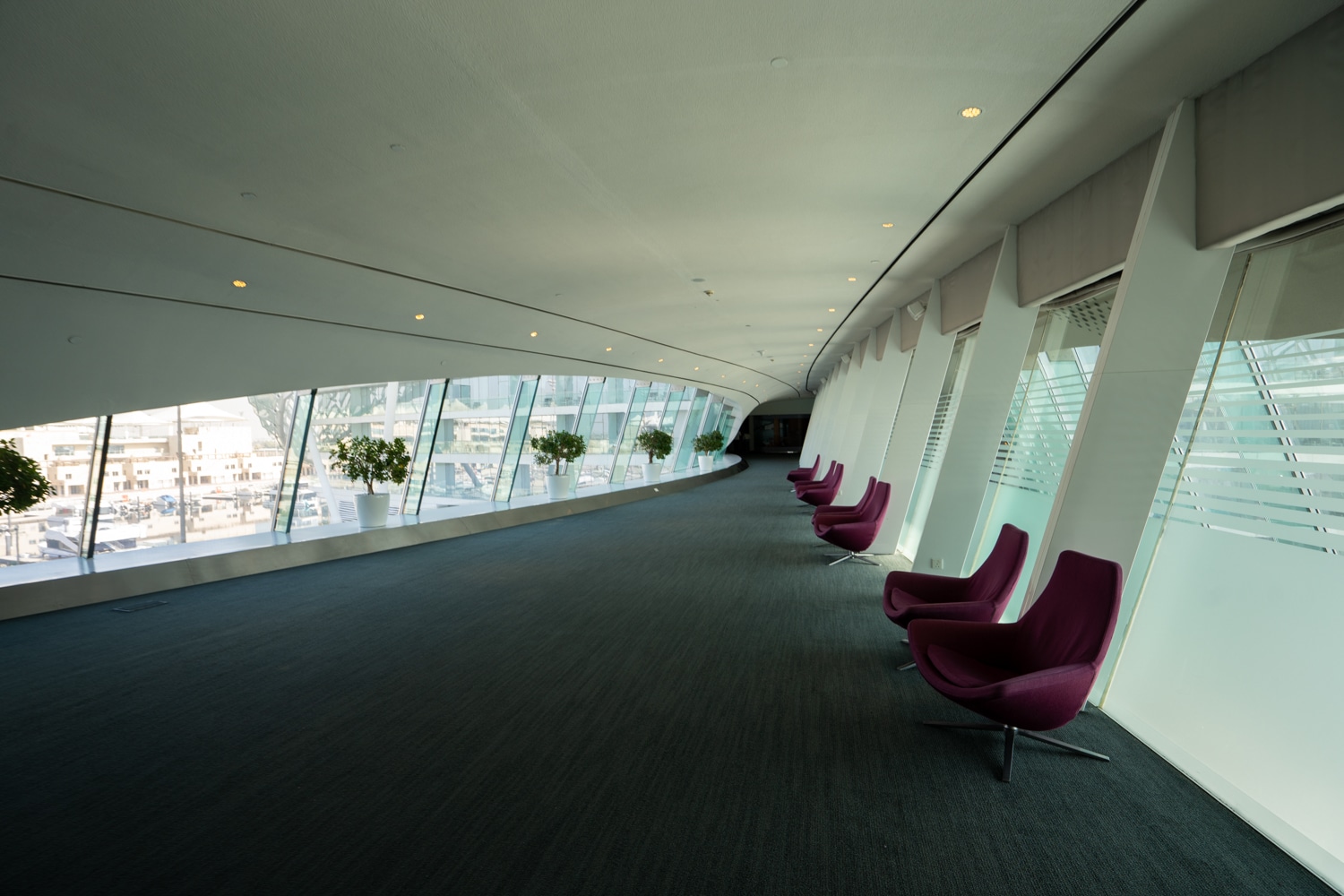 There are four check-in desks to the right, depicting “oil drops” inspired by the country’s economic history, whilst the wall behind is decorated with pegs as an ode to pearl divers in the region.
