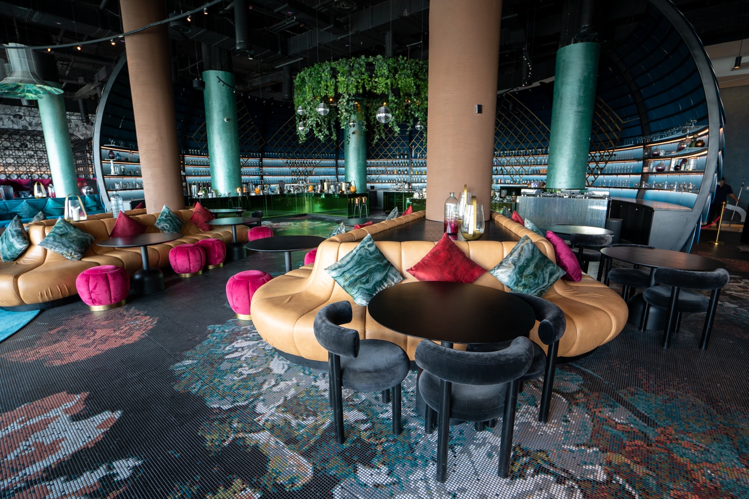 Energetic plush seating lends splashes of colours, which vary from bench-style arrangements to bright red booths accentuated by bronzed caging.