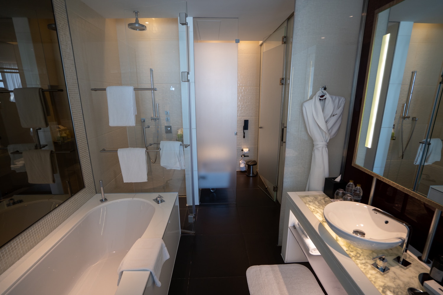 The suite had everything we needed for a comfortable stay, complete with a desk, living area, bedroom, oversized bathtub, and ample space, while the floor-to-ceiling windows, despite the partial obstruction, offered impressive views of the racetrack below.