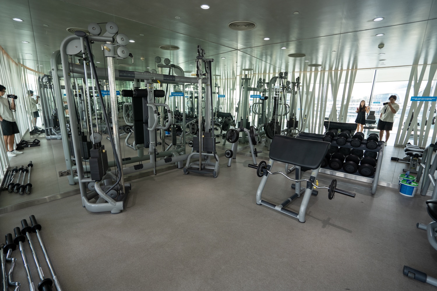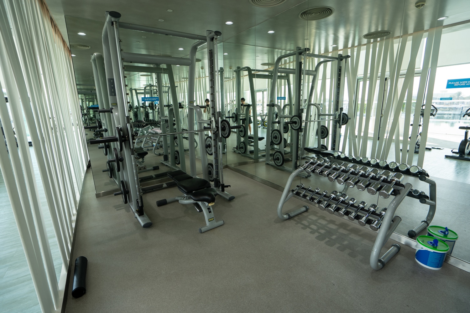 The FIT fitness centre is large and well-appointed, with a diverse range of equipment. The fitness centre has two sections, one with cable machines and free weights for strength training, then the cardio equipment and weight machines are dotted along the windows.