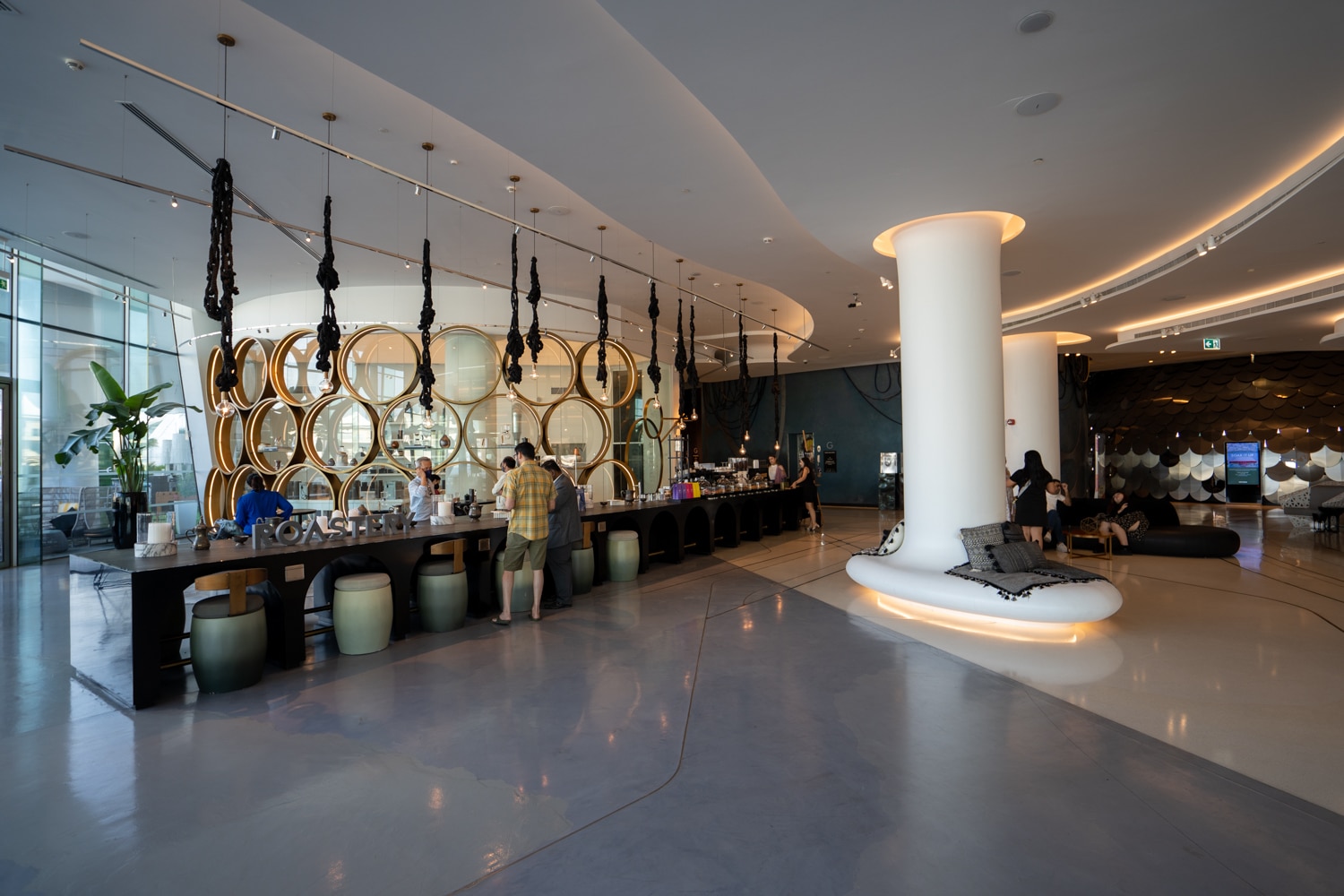 Adjacent to the check-in area, there’s ample jewel-toned seating with velvet upholstery dotted around The Roastery, the hotel’s lobby café.