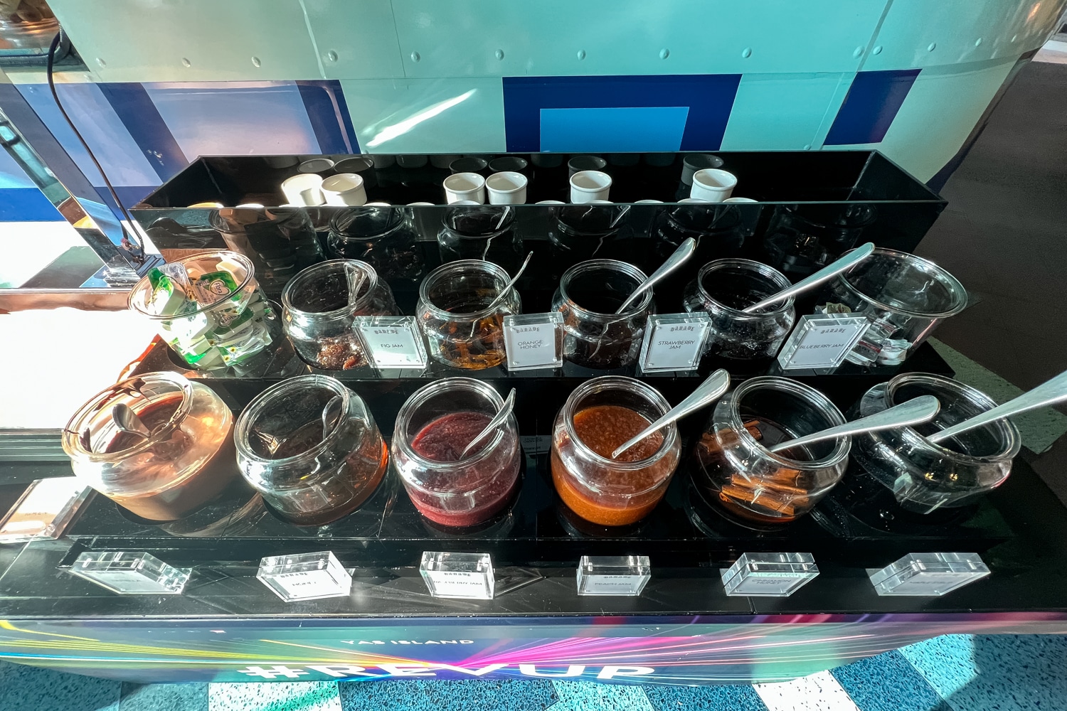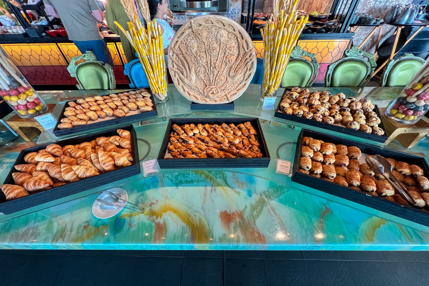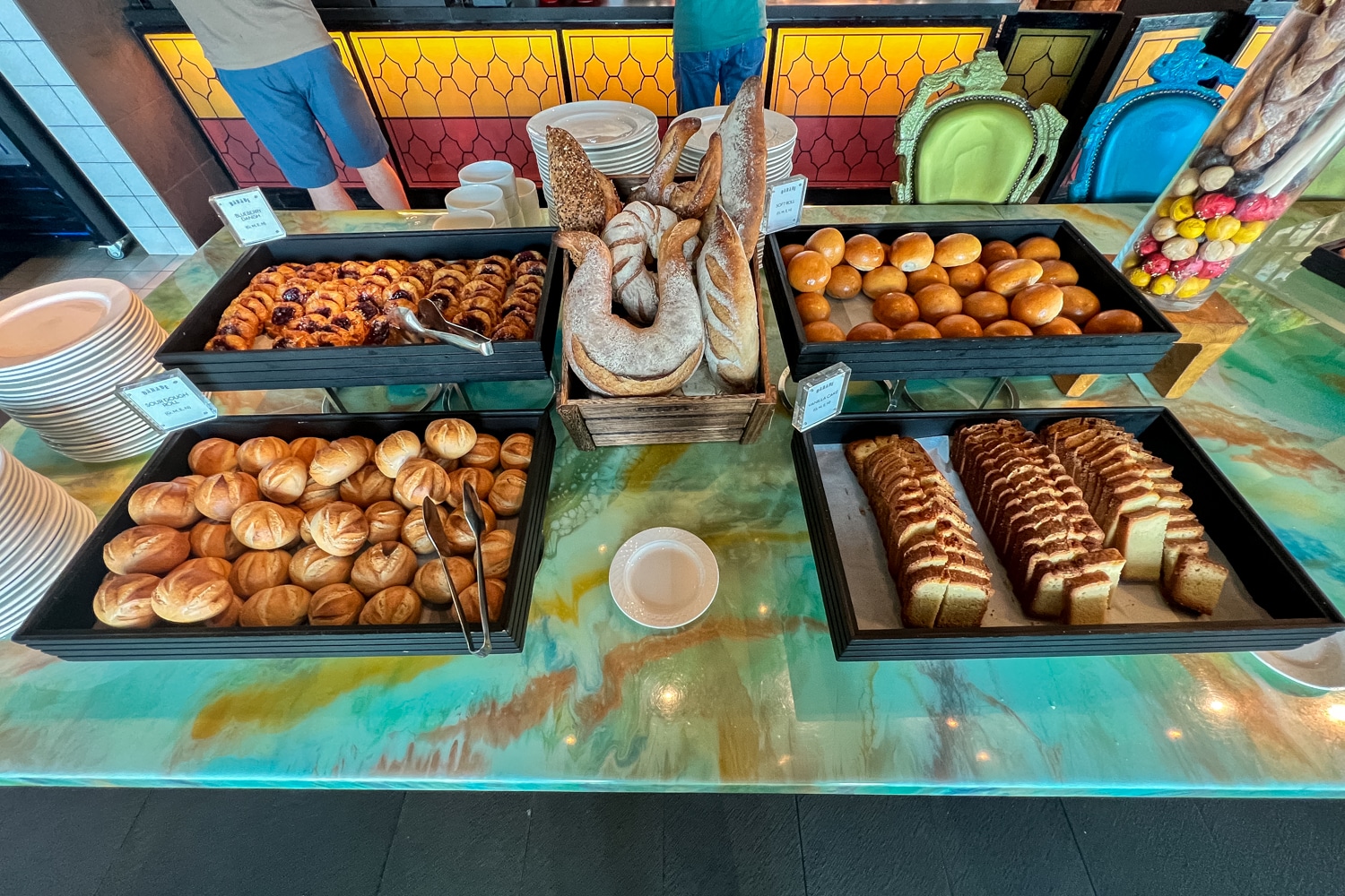 On one end, there’s a wide selection of bread, pastries, and jams available.