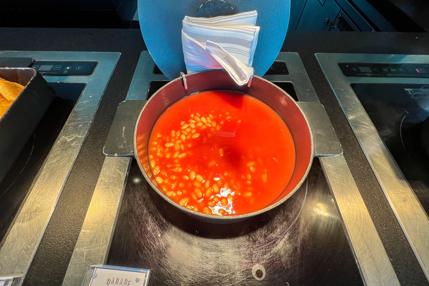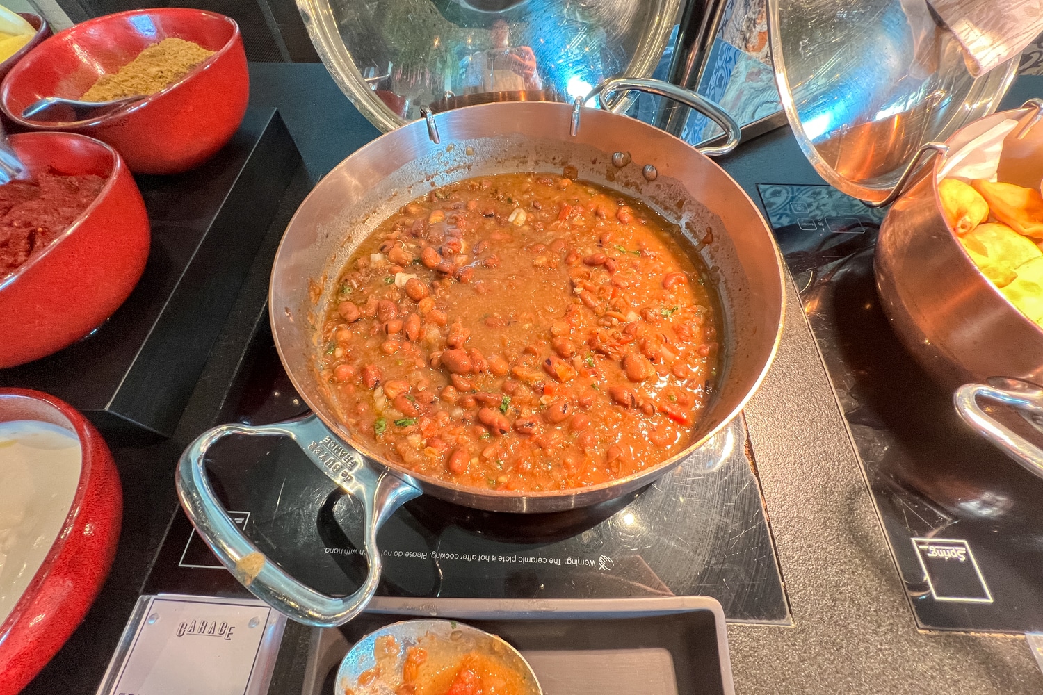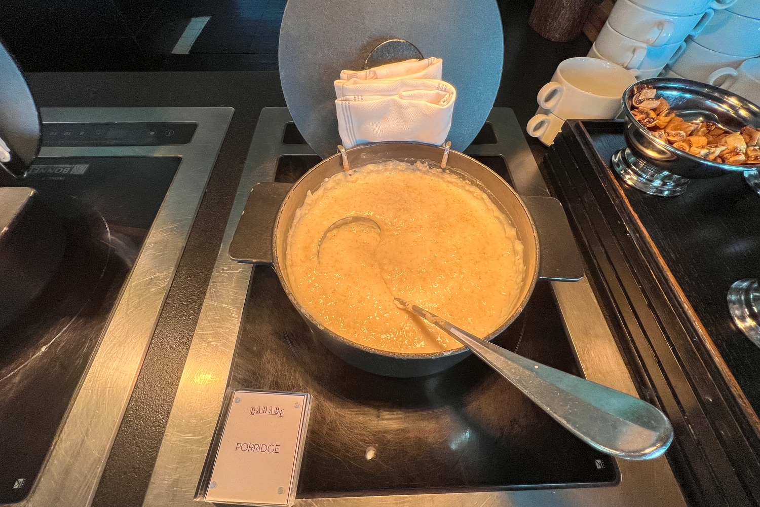 Western hot items included porridge, beans, eggs, hash browns, roasted potatoes, waffles, pancakes, and roasted potatoes.