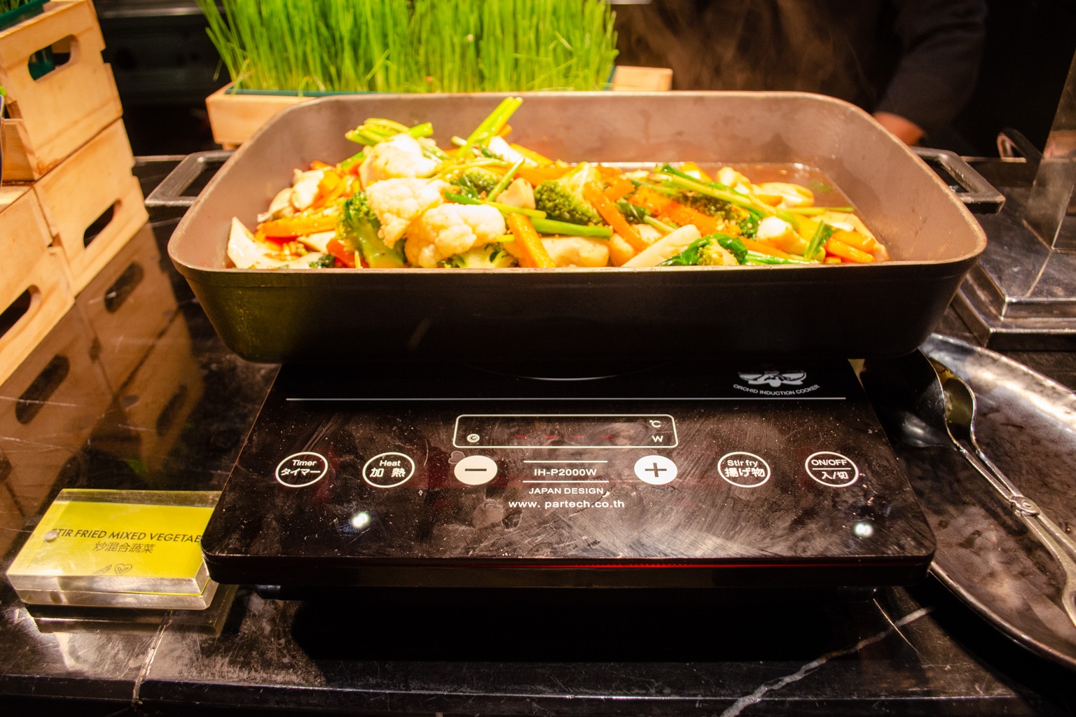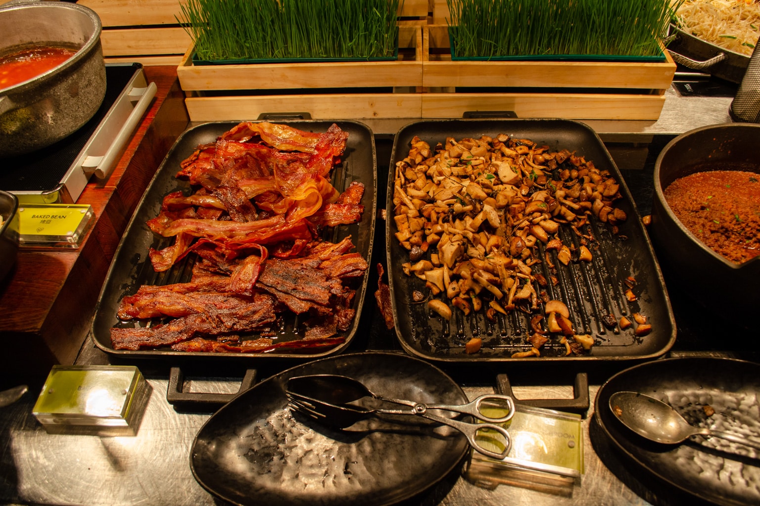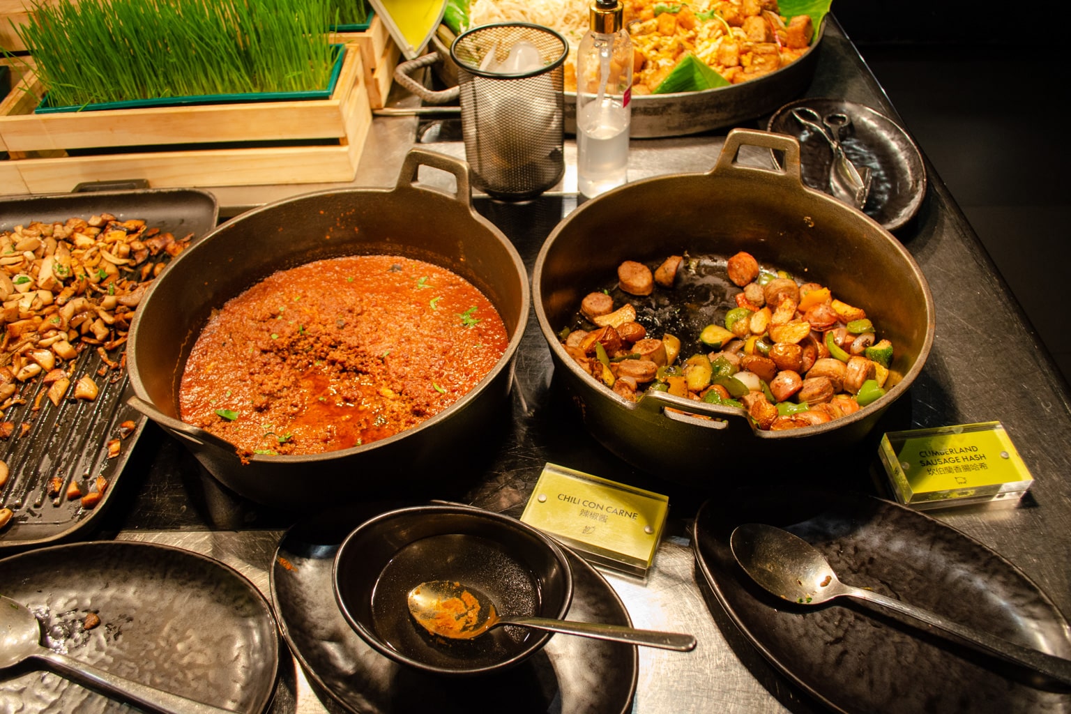 Hot buffet items available at the W Bangkok include items from all over the world, including chile con carne, wok-fried chicken with holy basil, stir-fried squid, dumplings, dim sum, curries, samosas, and Western breakfast staples like bacon, hash browns, and fried mushrooms.