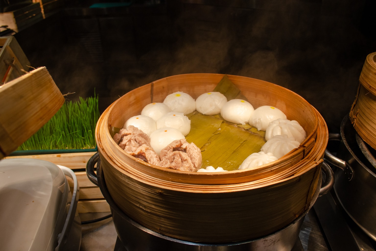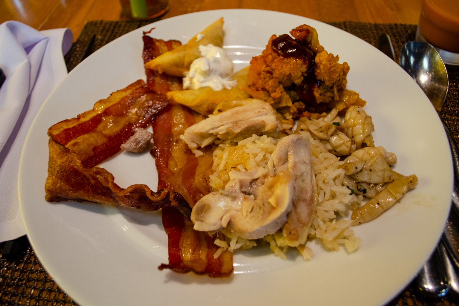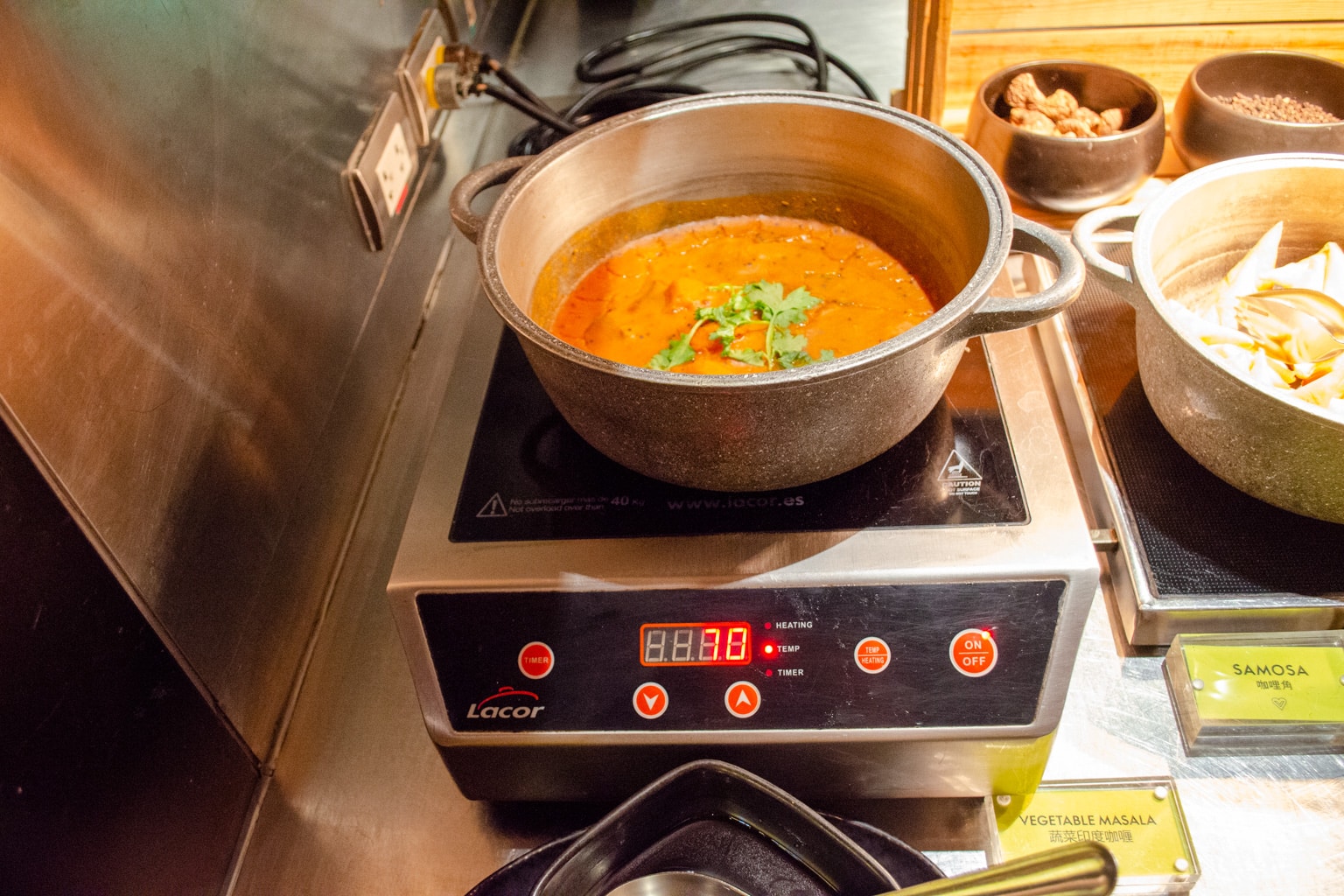 Hot buffet items available at the W Bangkok include items from all over the world, including chile con carne, wok-fried chicken with holy basil, stir-fried squid, dumplings, dim sum, curries, samosas, and Western breakfast staples like bacon, hash browns, and fried mushrooms.