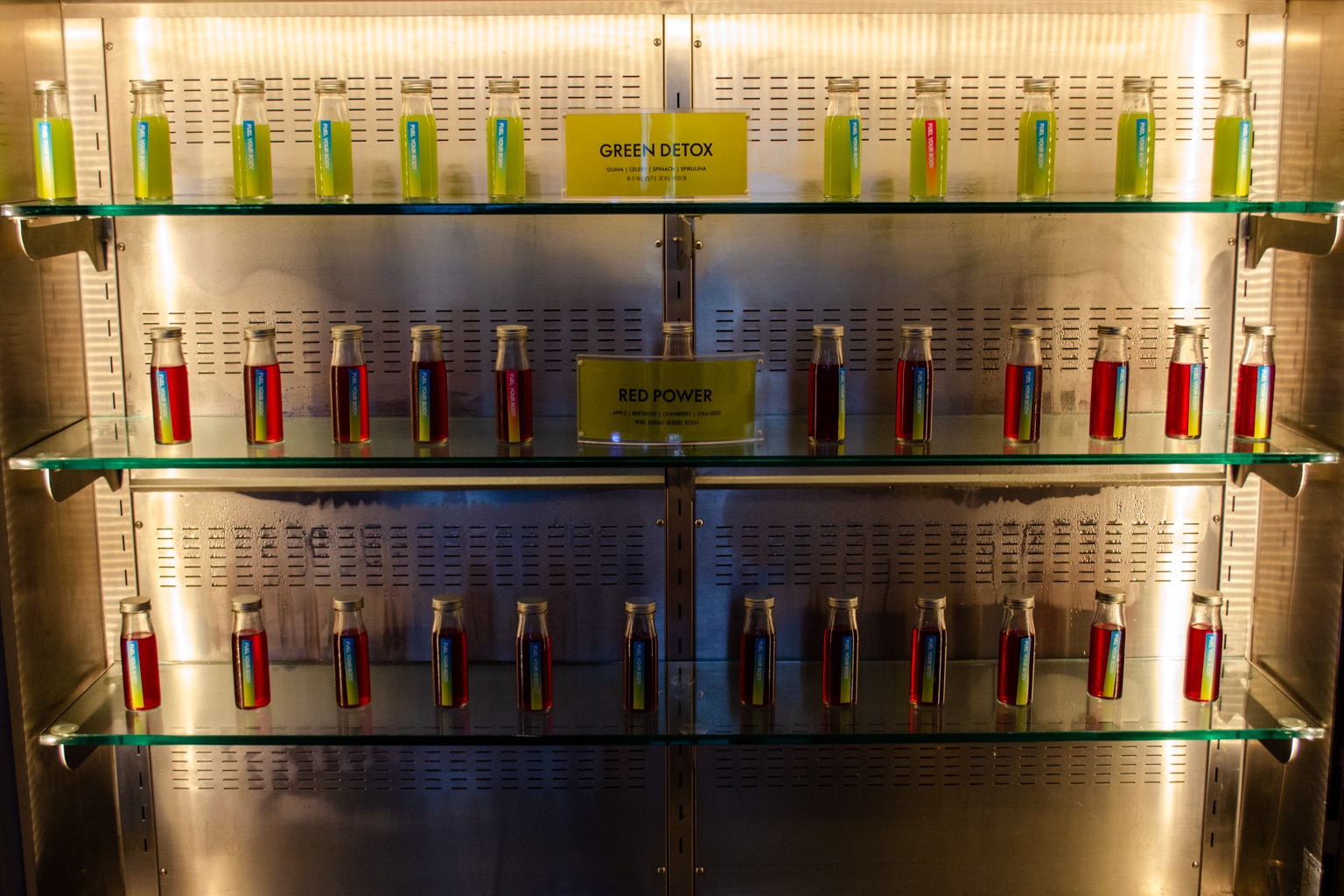 We were welcomed by a team of hosts and bartenders, and saddled up at the stunning bar. The entire room had intricately carved designs in the wooden door frames, and the glowing pink colour coming from under the bar provided a lovely contrast to the greens in the paint and greenery, as well as the glowing bottles.