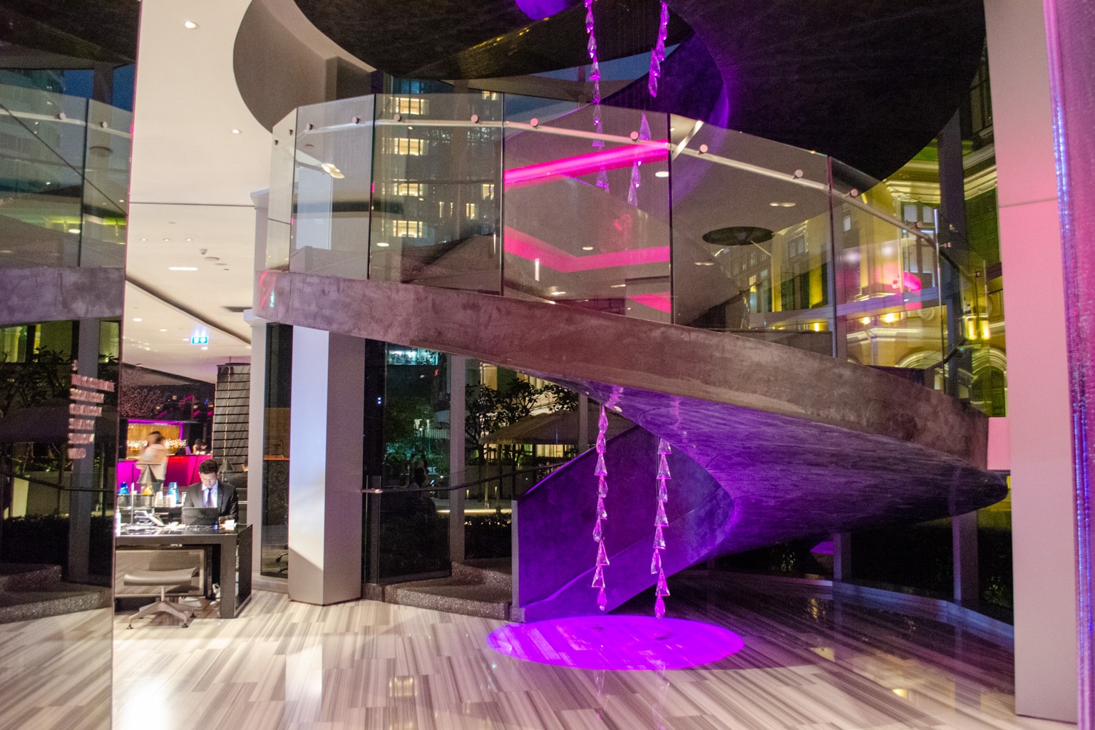 The lobby lounge at the W Bangkok is fairly minimalistic, with a low-to-the-ground sofa resting in front of a large logo emblazoned on a bright wall, a spiral staircase that leads up to some dining venues, and some delicious iced beverages located off to the side.
