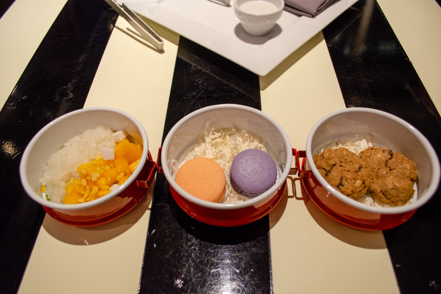 On the table was a note from the hotel’s manager and a rather delicious welcome gift of mango sticky rice, macarons, and cookies.