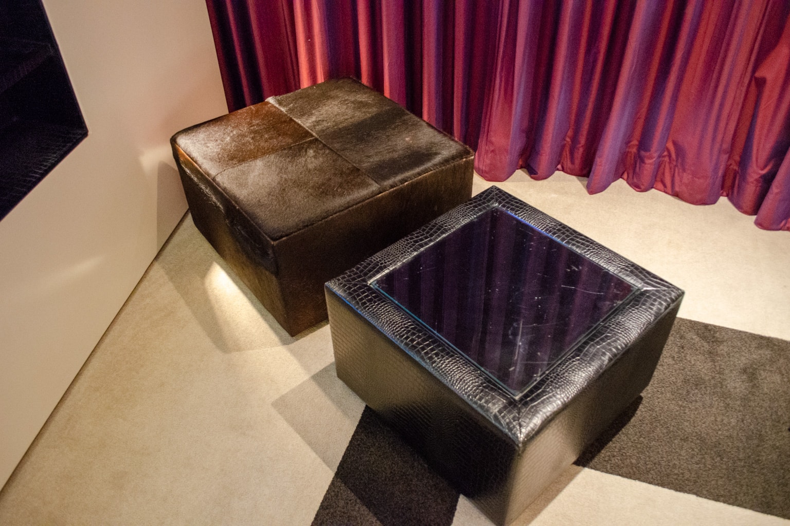 The living room in the Marvelous Suite is quite spacious, and would be perfect for hosting a small gathering. There is a large, four-person couch set against a jet-black wall that separates the living room from the bedroom. A black-and-white striped table sits in the middle of the room, with square and circular ottomans available as extra seats.