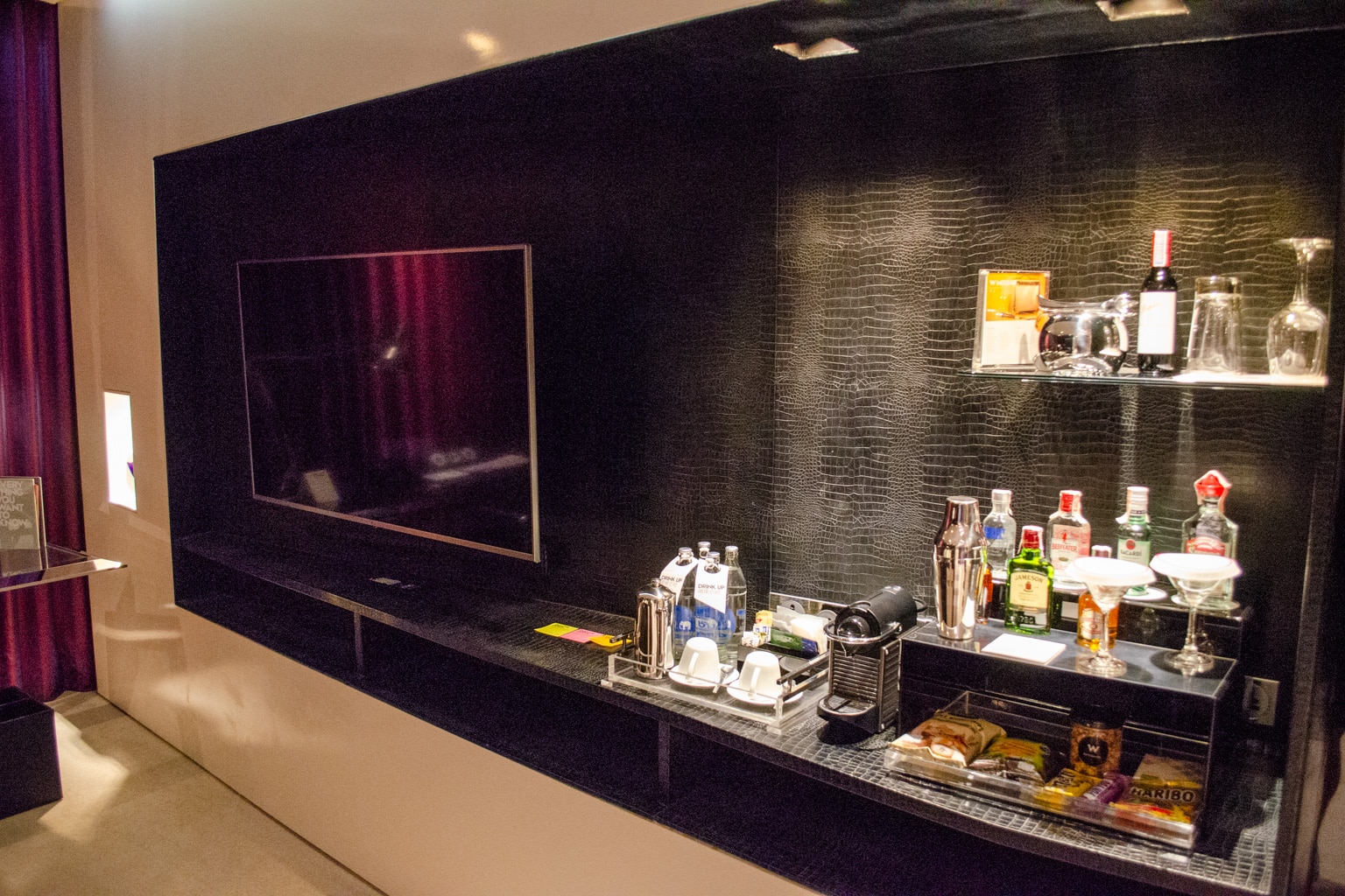On the opposite wall from the couch is a large flat-screen TV and the room’s not-so-minibar. There was plenty of booze and snacks available at a steep cost; however, there were also many bottles of water and a coffee maker that came without any sticker shock.