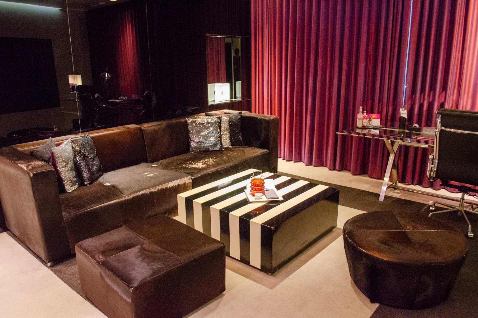 The room’s foyer has a transparent purple glass partition that provides a break between the room’s secondary bathroom and the cowskin furnishings in the living room.