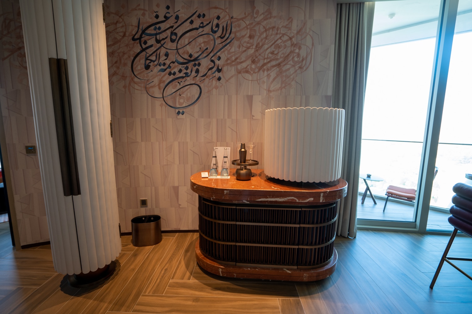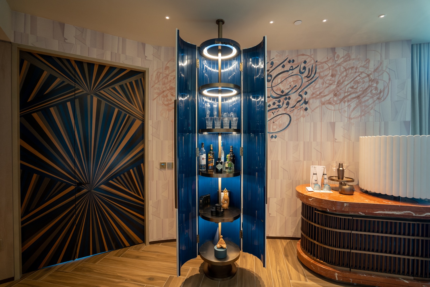 The room consisted of metallic tones and warm colours that were intended to honour the sunset, an age-old symbol of storytelling. Upon entering, the left-hand wall features an artistic display of traditional Arabic calligraphy.