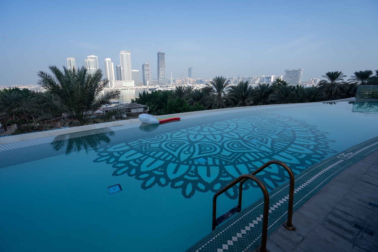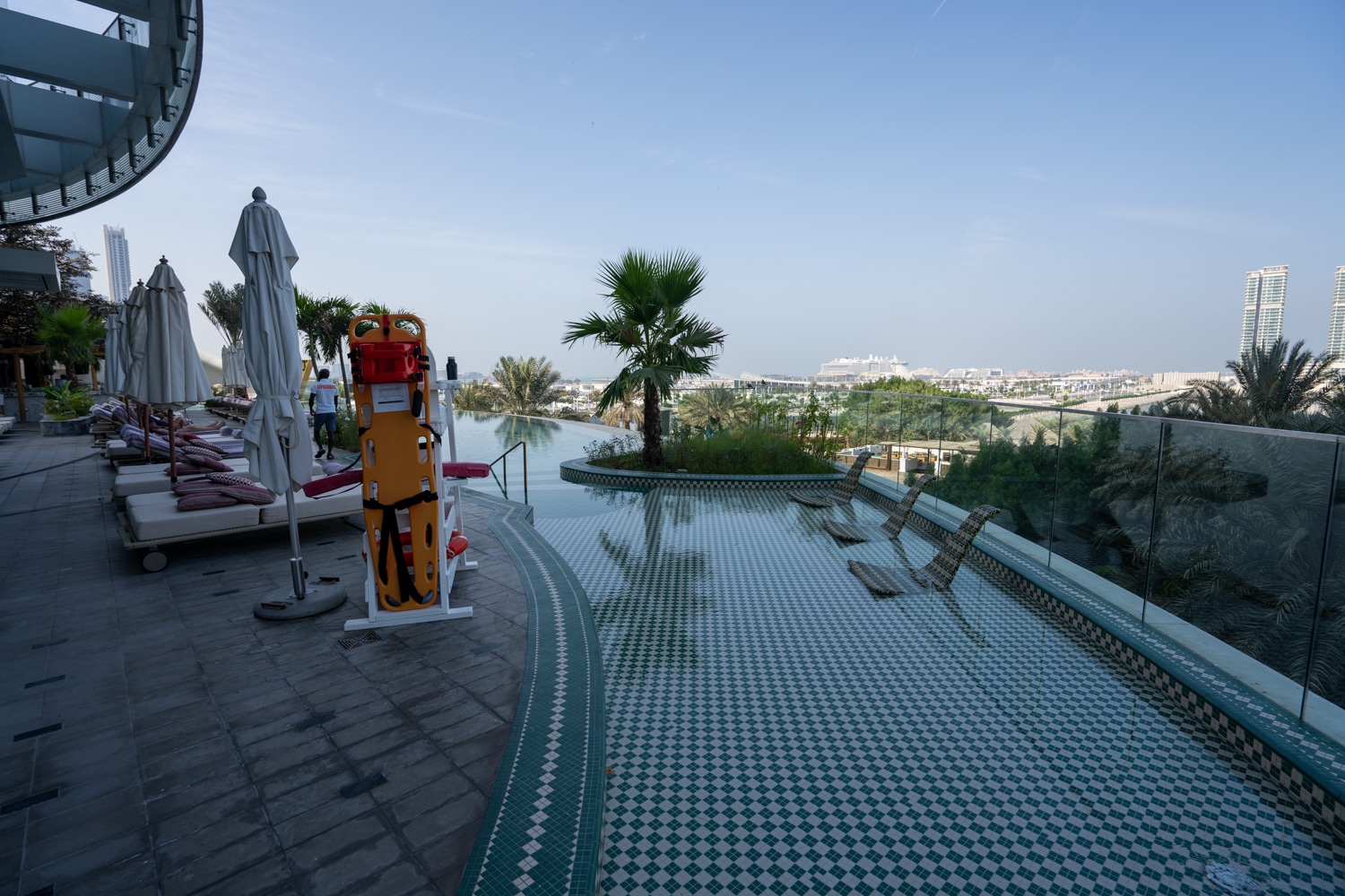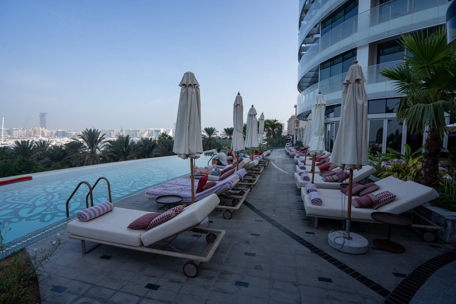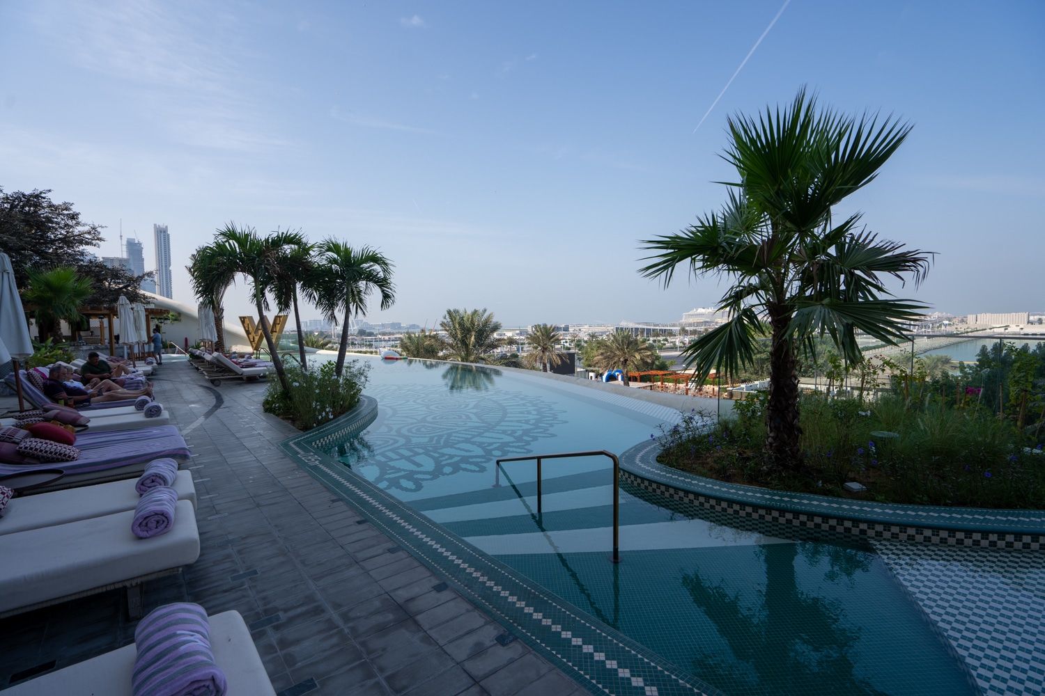 The well-appointed pool deck is lined with lush palm trees and comfortable lounge chairs and offers magnificent views where the Dubai Eye looms in the distance.