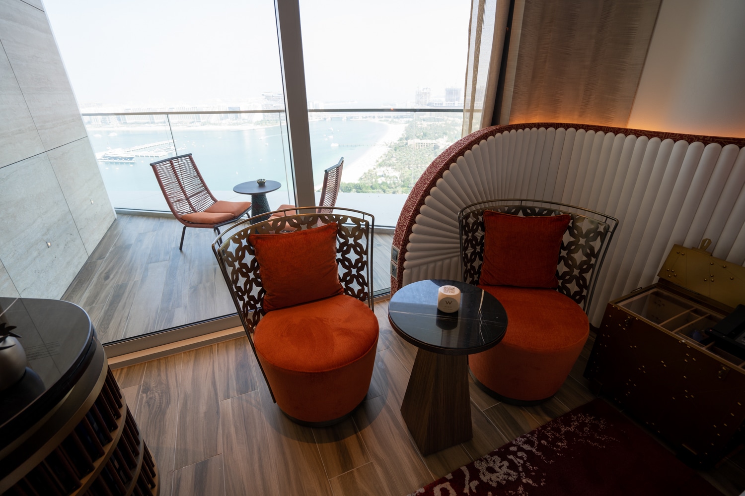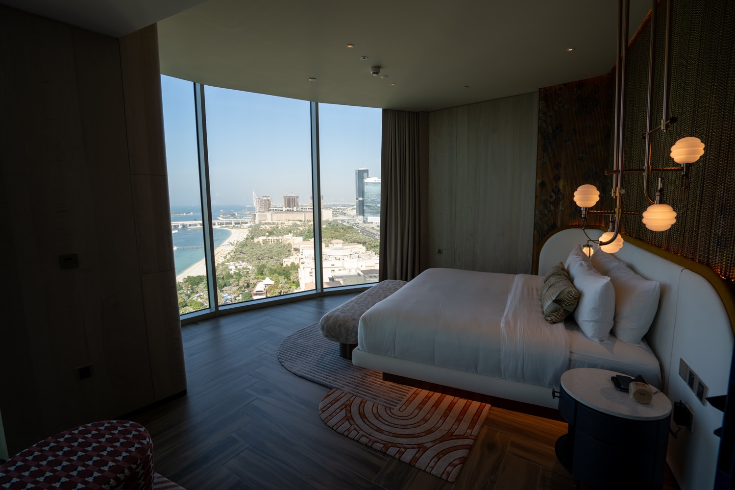 Just as remarkable as the suite itself are the sweeping views of the Arabian Gulf and Dubai Marina from the floor-to-ceiling windows.