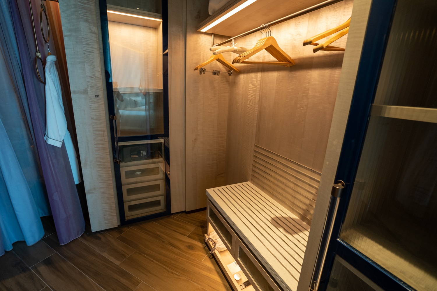 This room offers a private balcony with stunning views of the sea below, as well as two comfortable chairs for outdoor leisure. Similar to the Marvelous Suite, there is a spacious walk-in closet that leads to the bathroom.