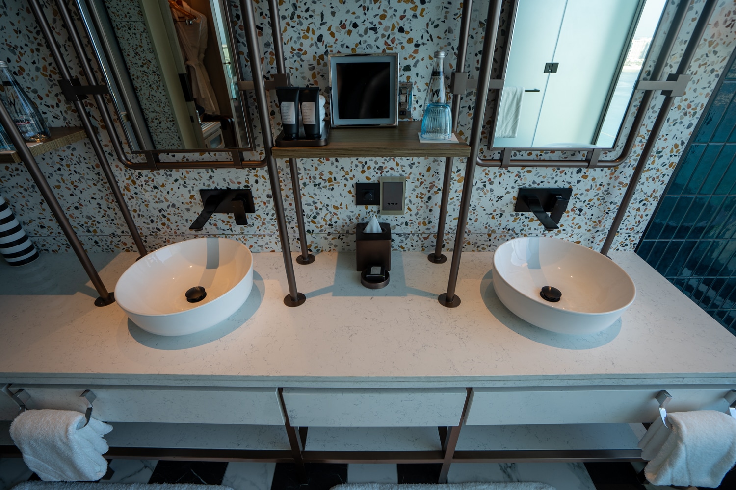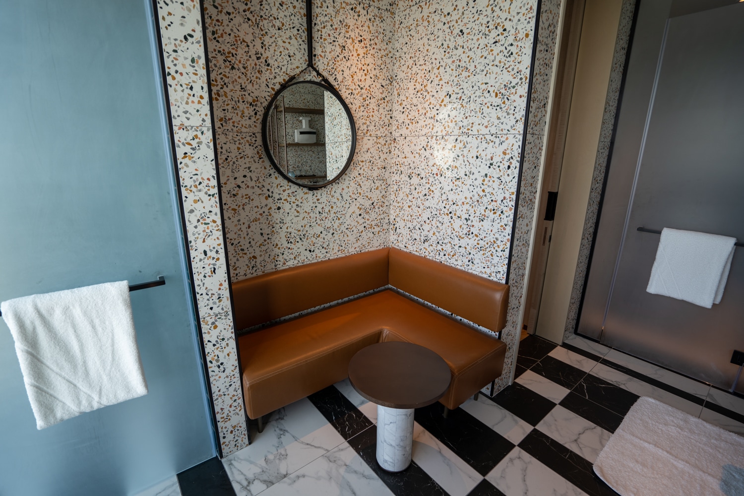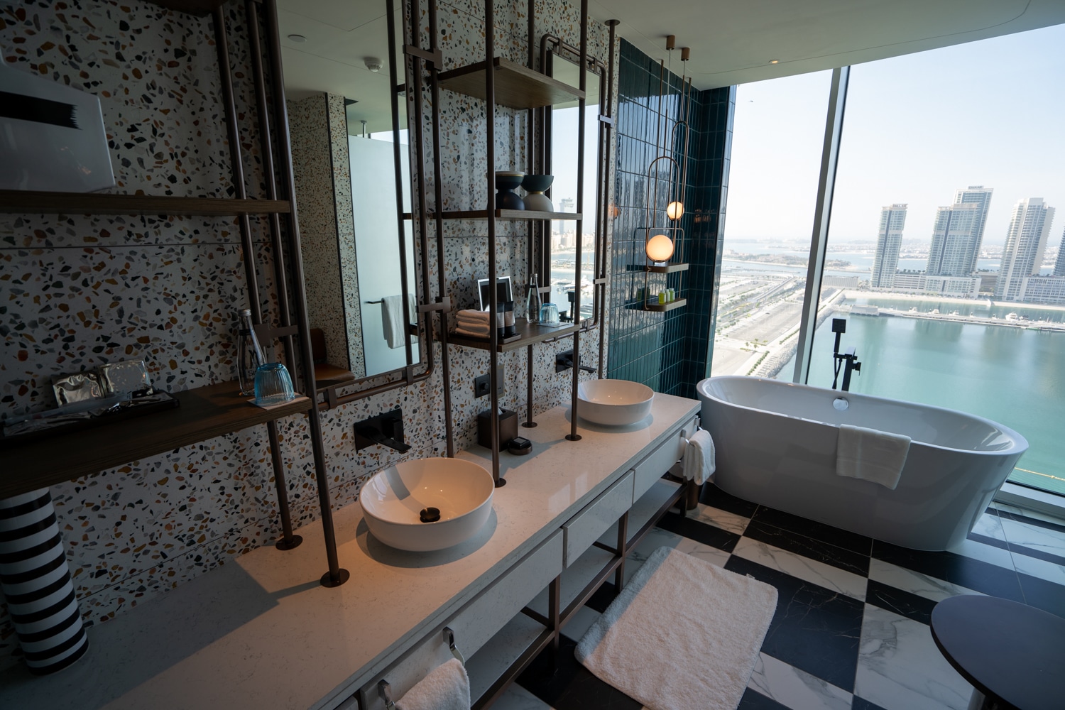 Overall, I was impressed by the detailed and thoughtful design of the rooms and suites at the W Dubai Mina Seyahi. The bathrooms in particular are quite remarkable, with unique elements such as retro tiling and unique brass accents.