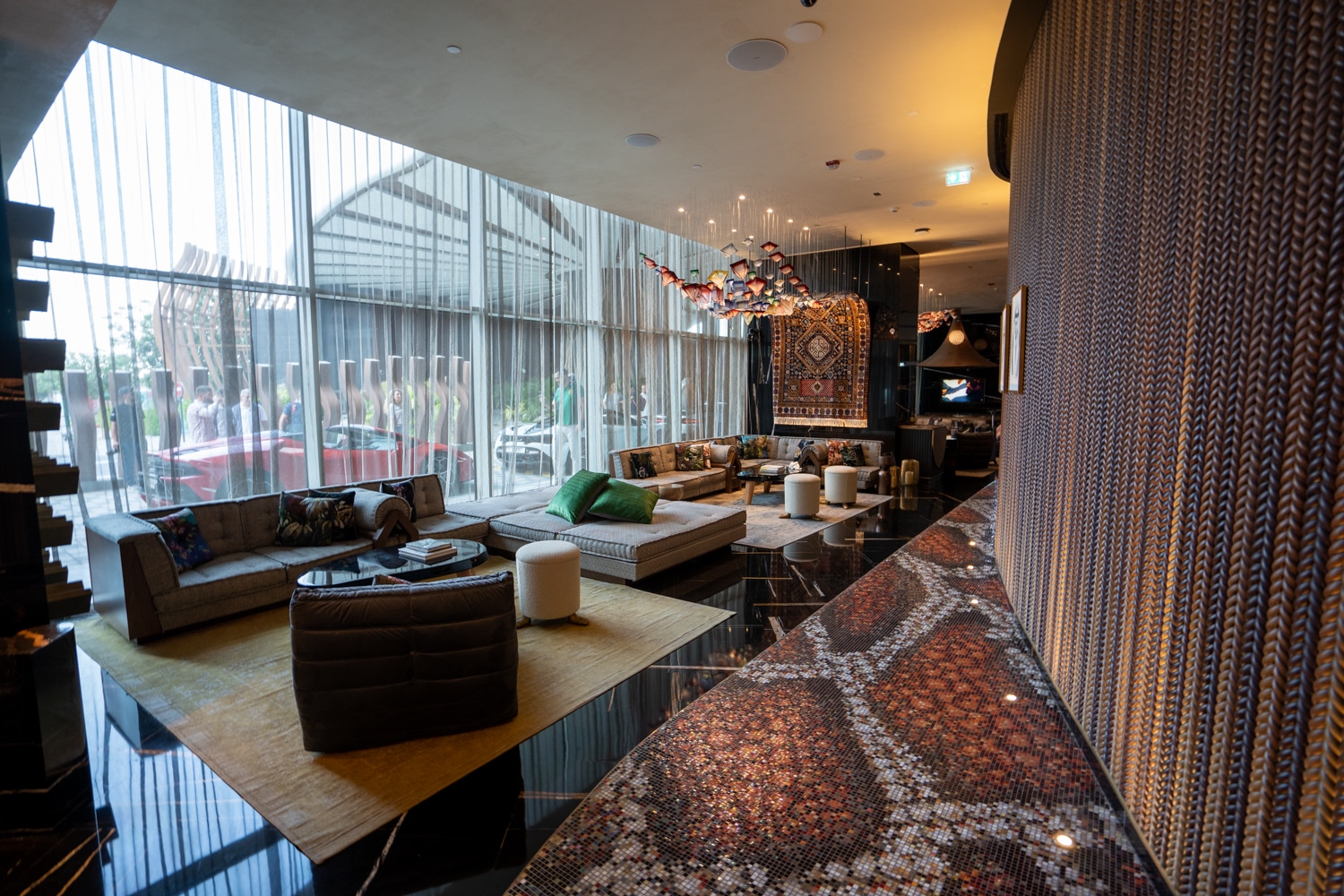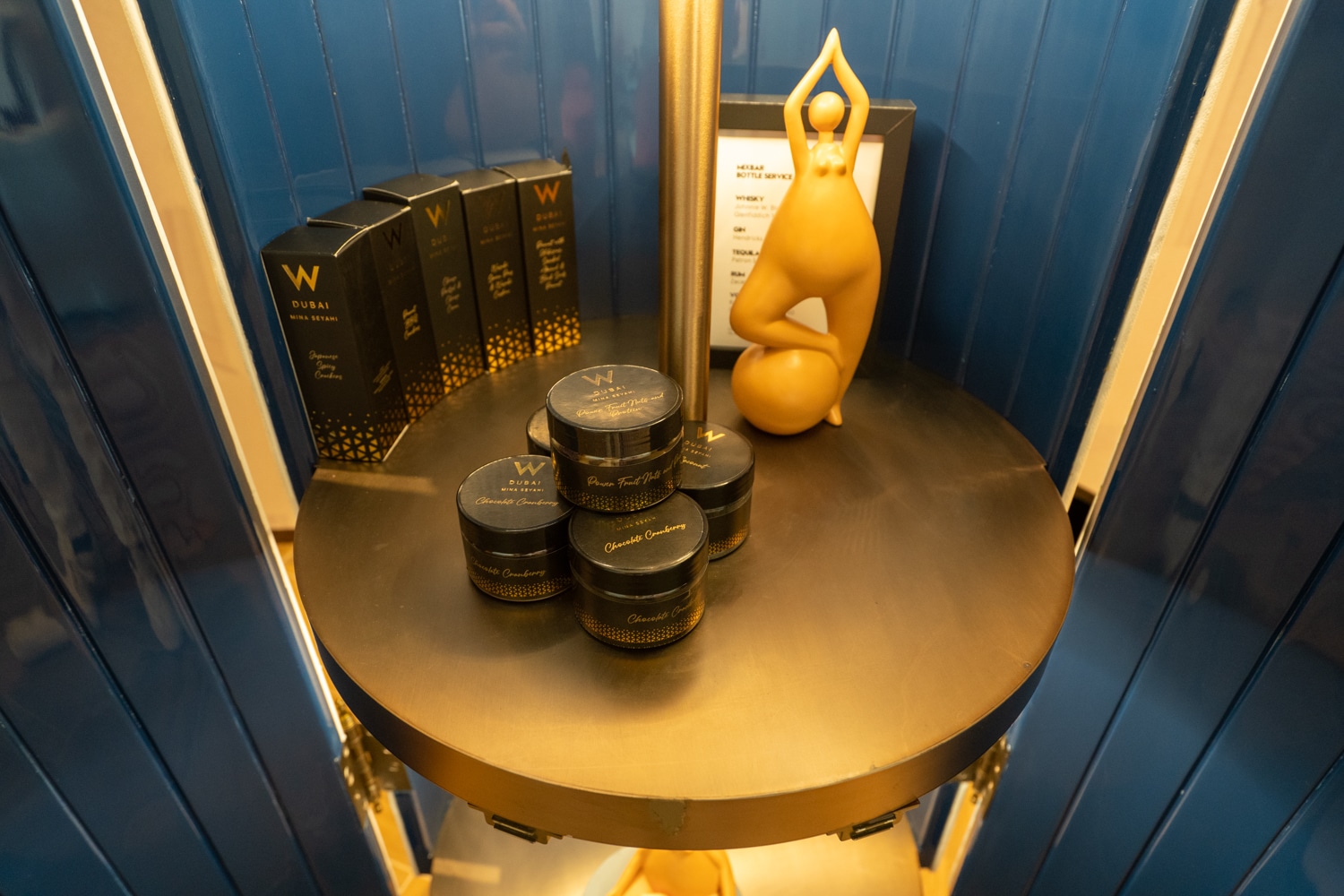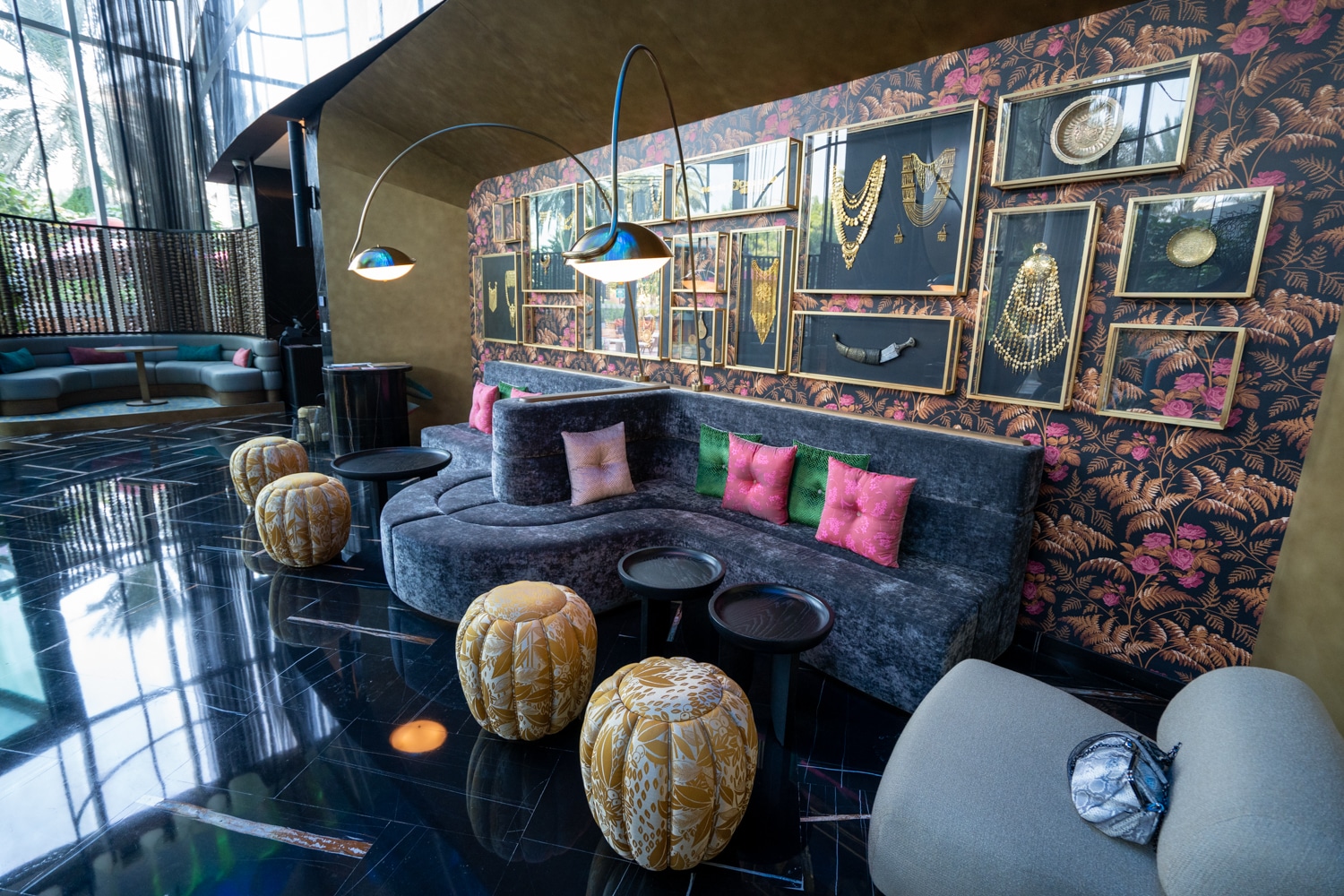 The adjacent plush upholstered column is initially unassuming, but opens up to reveal the W brand’s signature Mix Bar – a hide-and-seek bar design that felt thematically appropriate here in the Middle East.