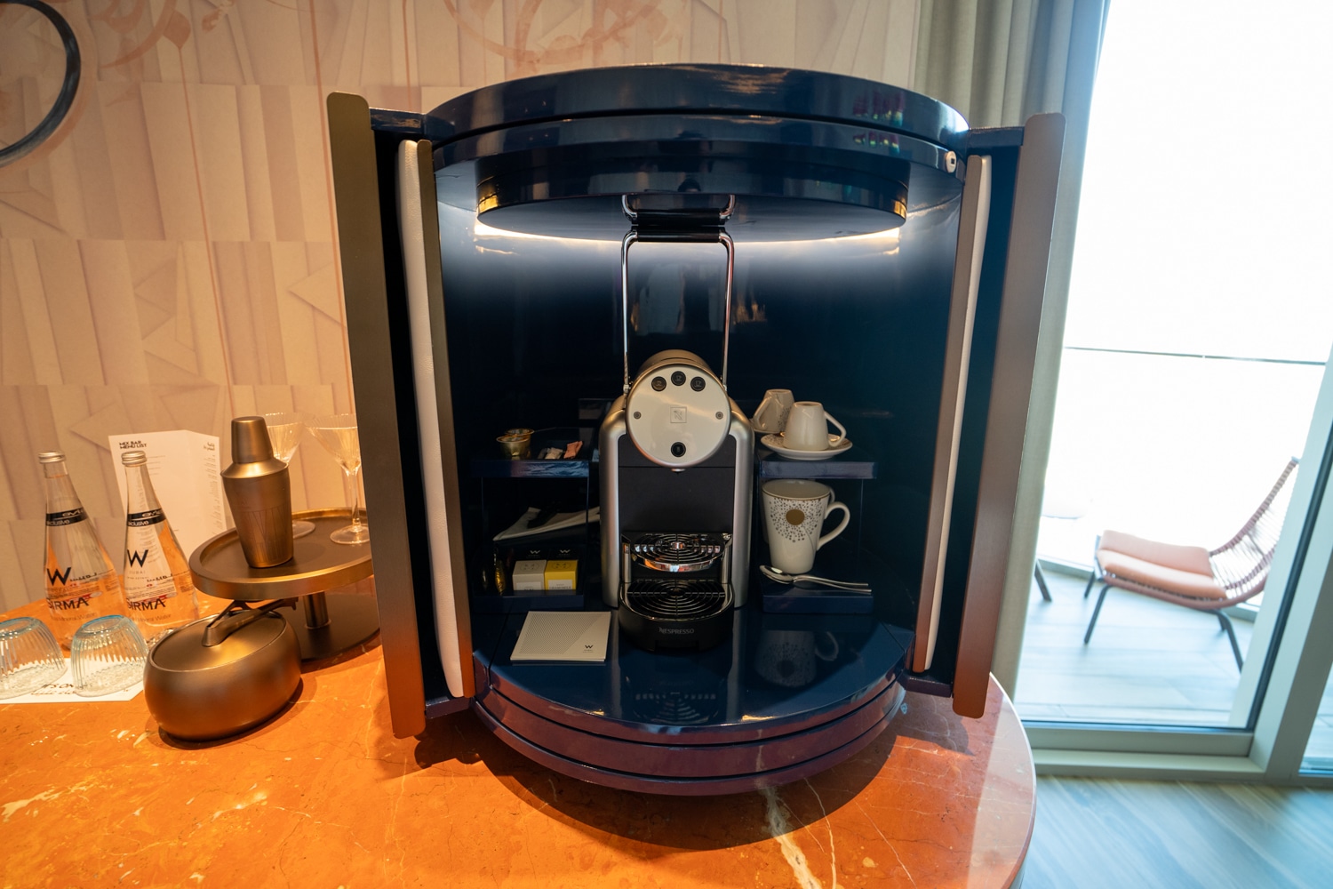 To the left is the fully stocked minibar, equipped with a padded rotating cover that reveals the Nespresso machine and the coffee and tea selection.