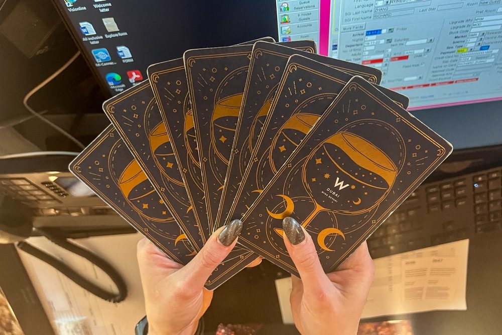 After confirming the details of my stay and benefits as an elite member, I had the opportunity to choose an additional perk from a set of W-branded tarot cards, which I thought was a creative touch.
