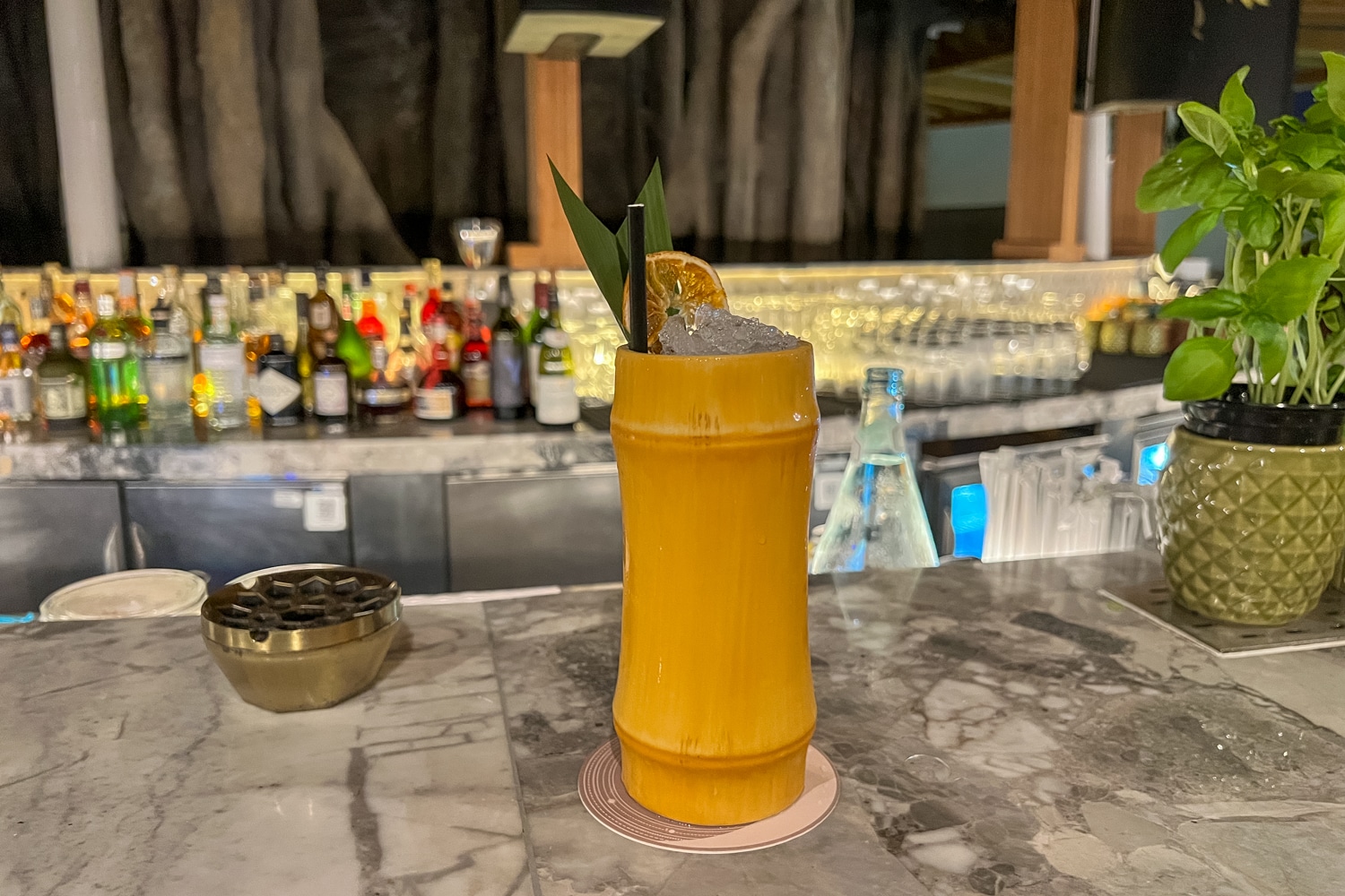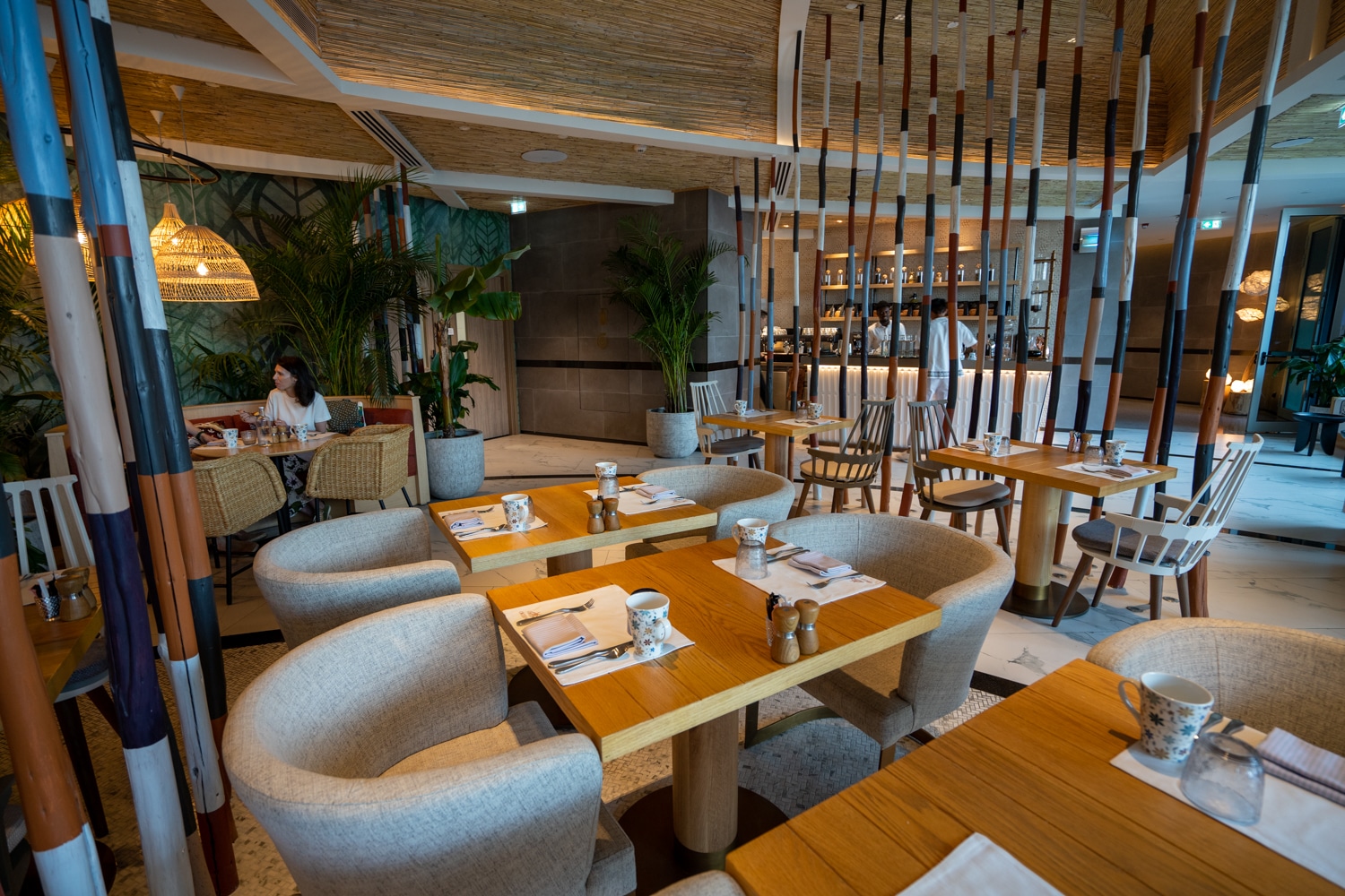 This space has a tropical ambiance, featuring luxurious vegetation, a wicker roof, and bamboo that stretches from the floor to the ceiling.
