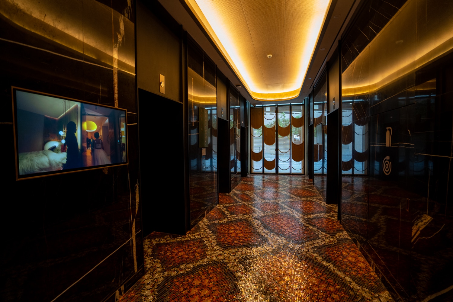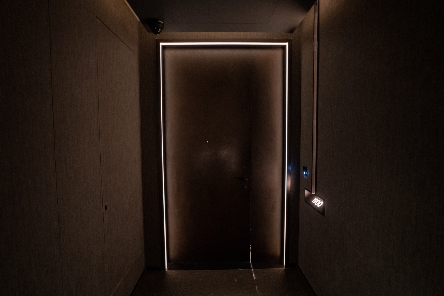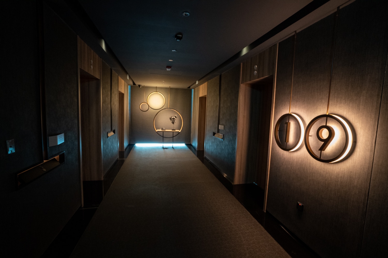 The elevator lobby had a dim, sombre ambiance, illuminated solely by the ceiling. The hallways to the guest rooms mirrored this subdued atmosphere, with minimal lighting beaming down onto the floor.