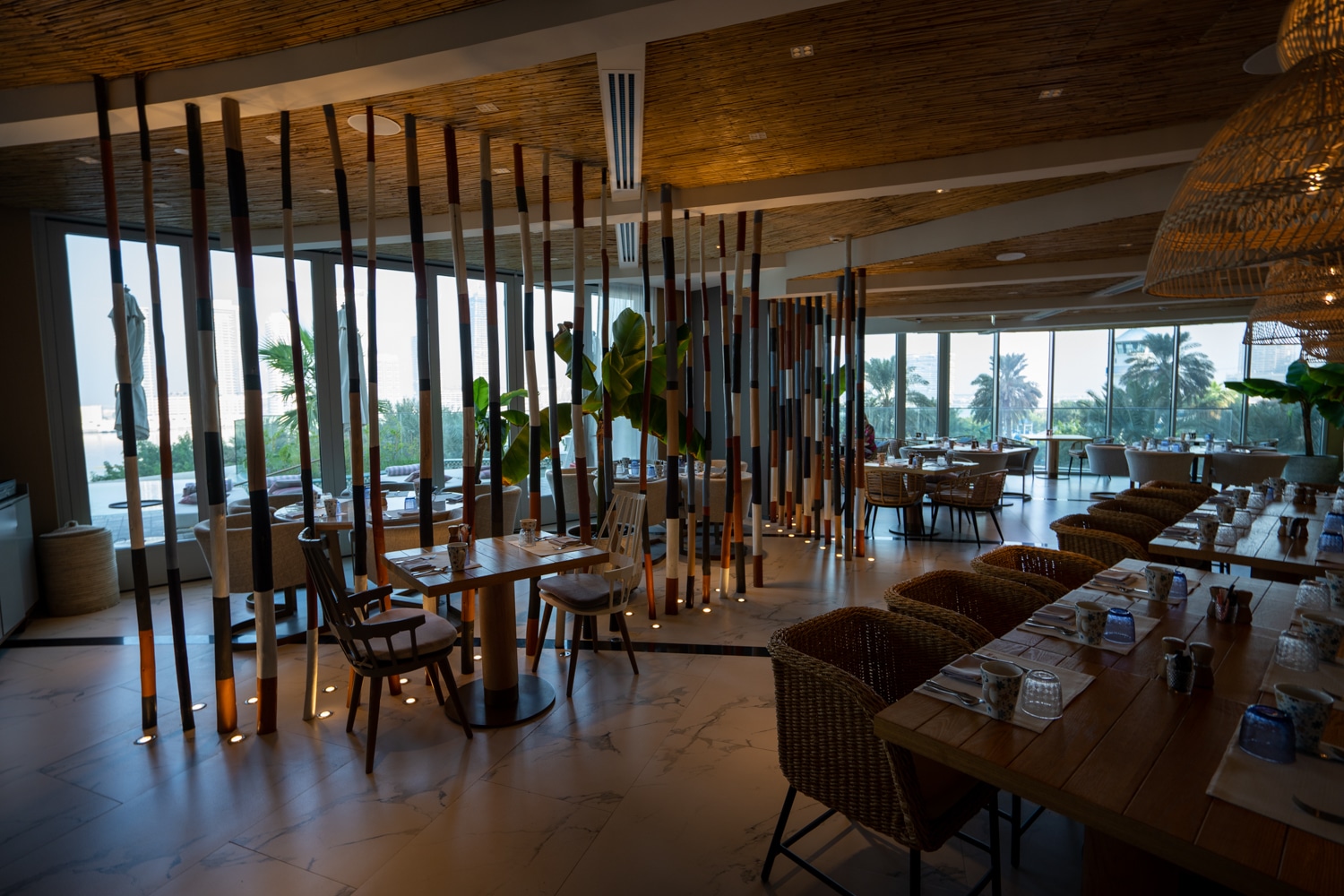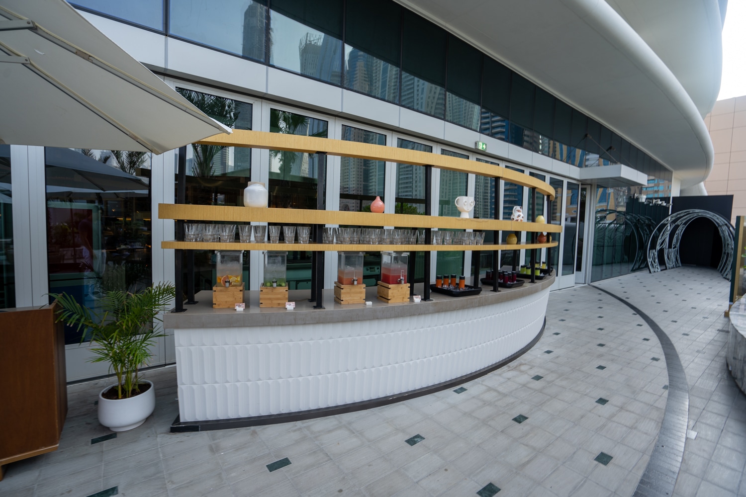There is ample seating to find a quiet corner to yourself. Alternatively, the terrace boasts breathtaking views of Ain Dubai and the Dubai Harbour as a picturesque backdrop for a meal.