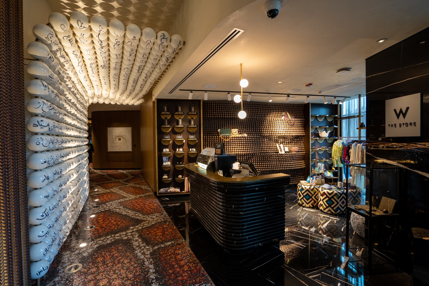 As I made my way to the elevator lobby, I passed a series of bespoke bulb installations adjacent to The W Store. Engraved on them were writings of Arabian Nights, which was another nod to storytellers in the Middle East.