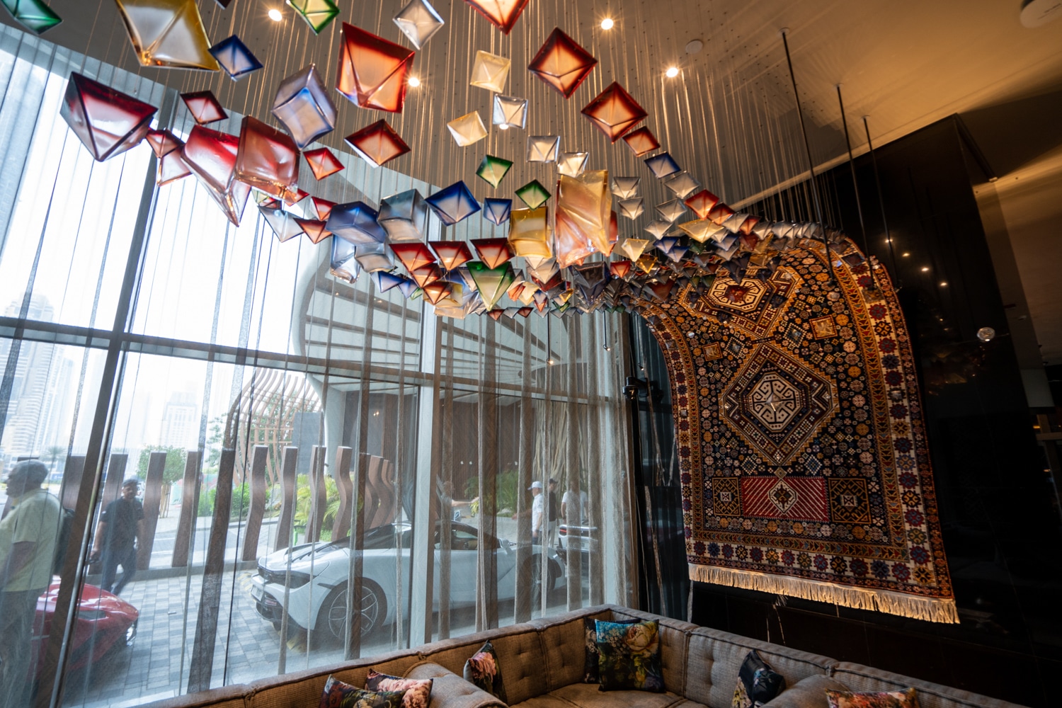 Above the seating area, mesmerizing Arabian carpets have been transformed to create a series of modern, colourful lamps symbolizing Dubai’s journey through the ages.
