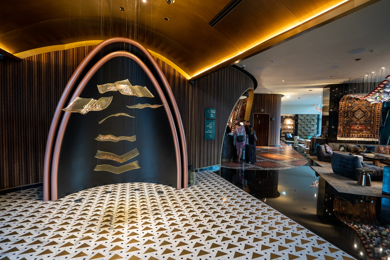 The lobby draws inspiration from Middle Eastern souqs (bustling markets), with warm colours and golden accents. The area is divided into three distinct zones, unified by a central hub.