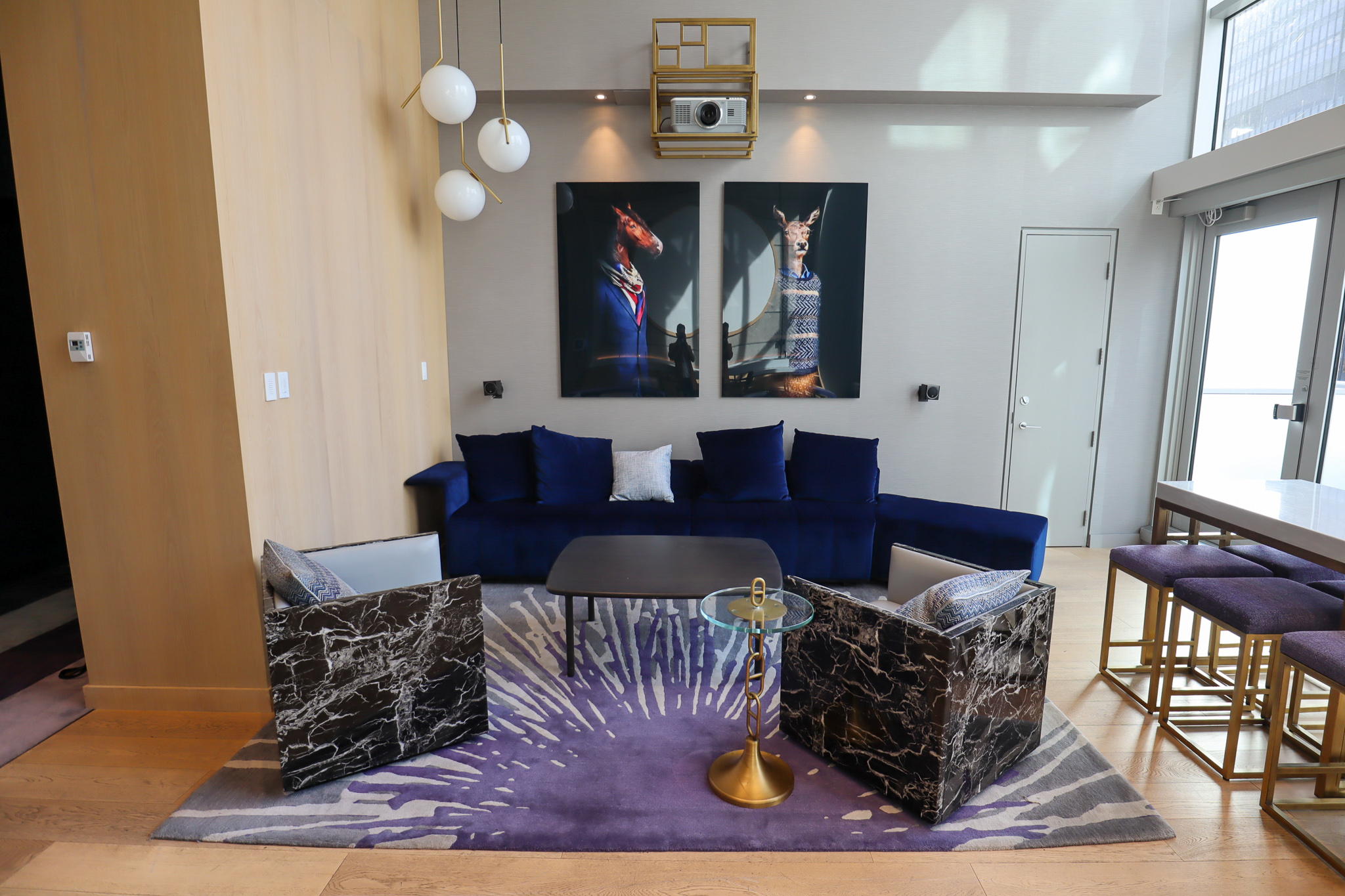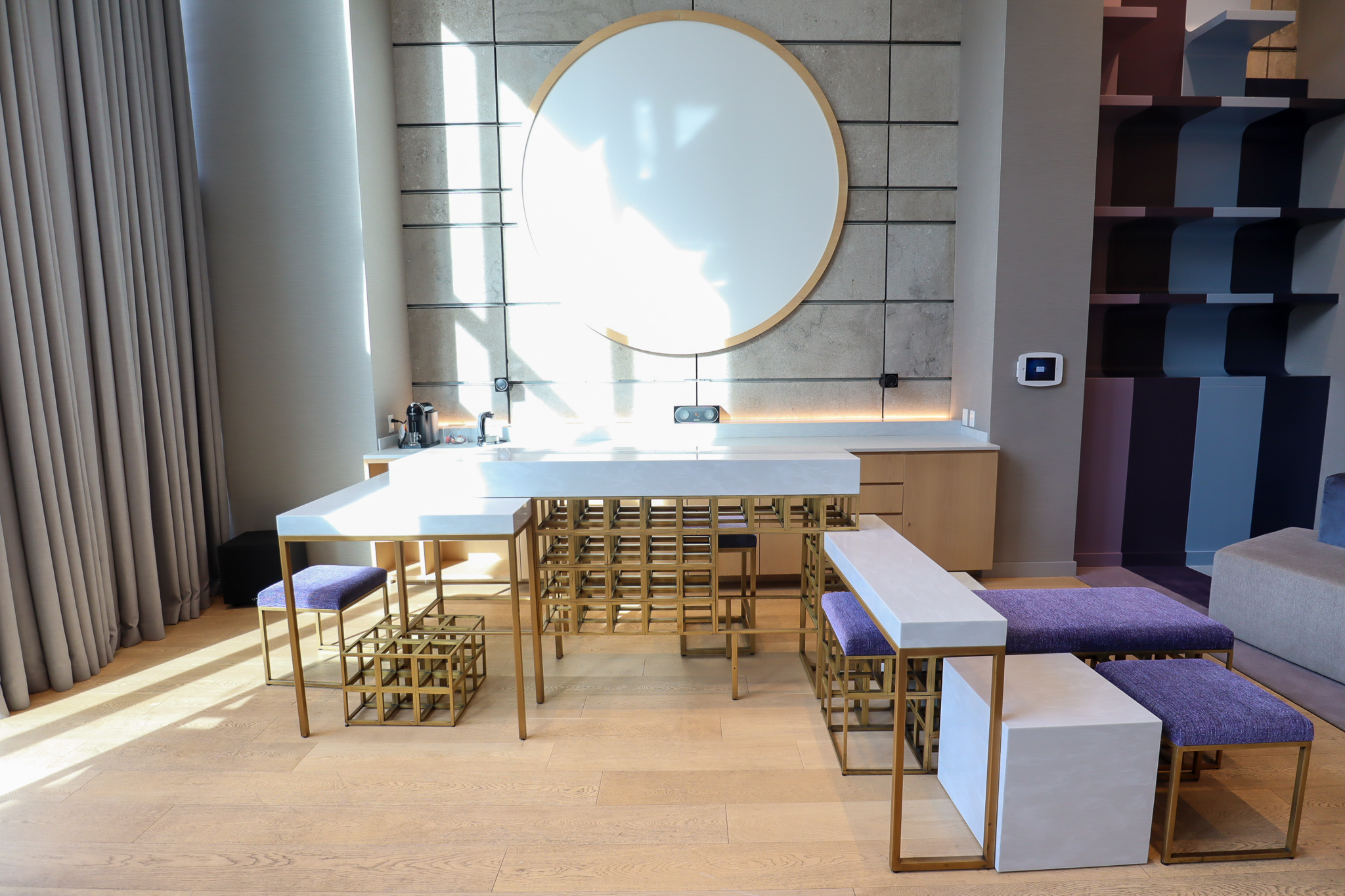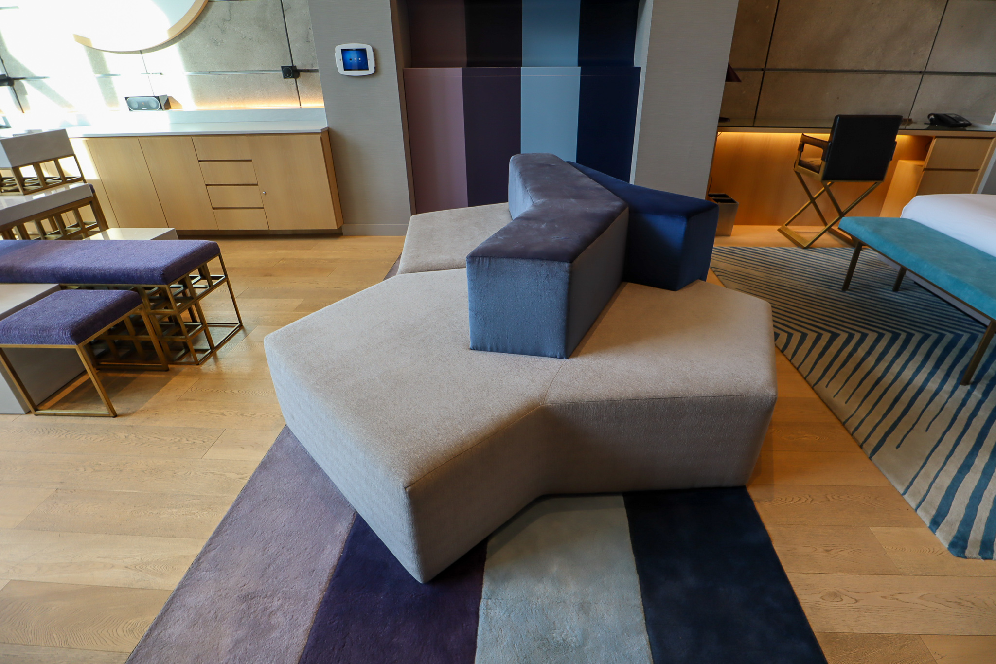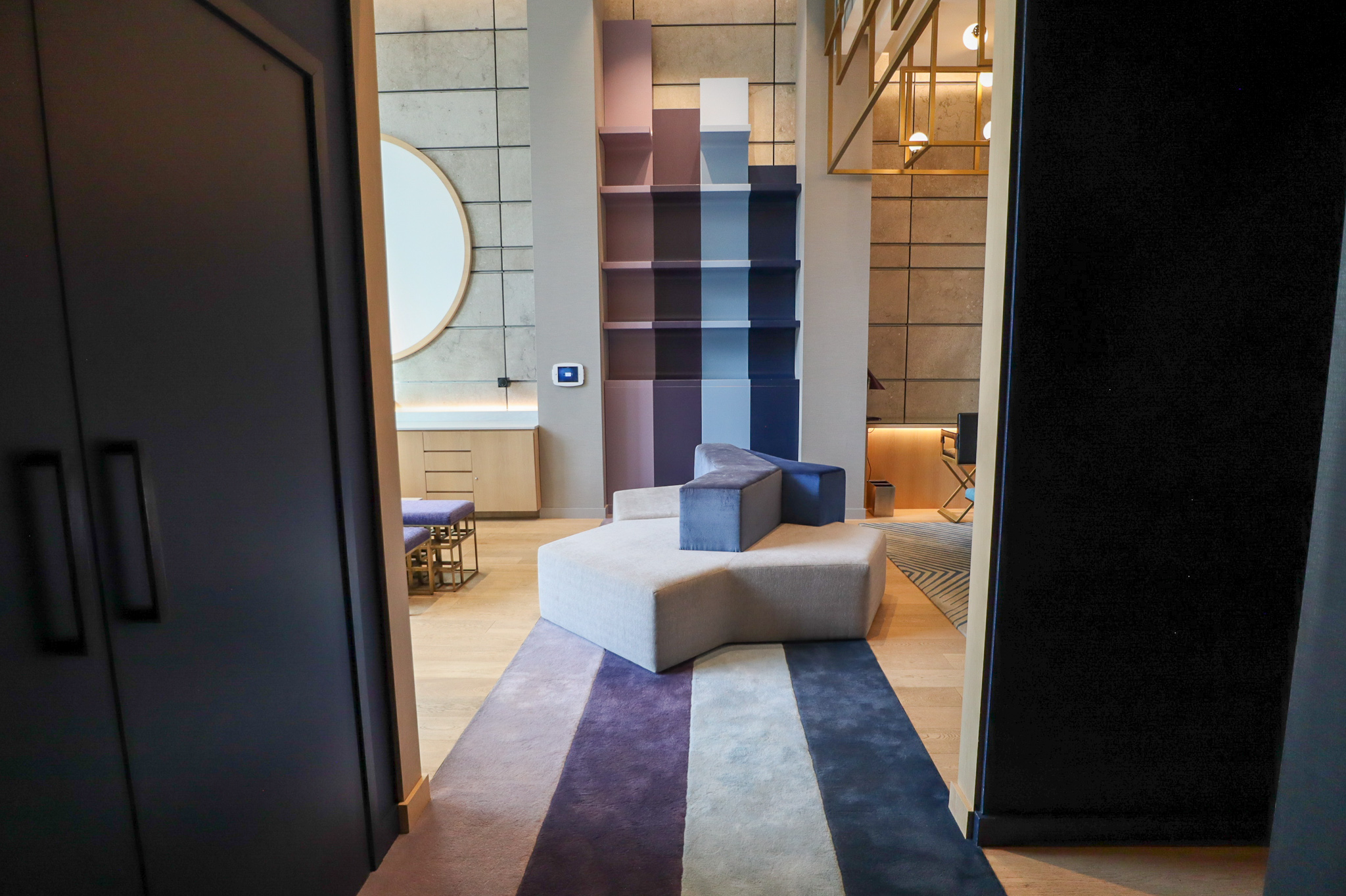 Turning to the opposite side of the living space, there’s an extended couch, a coffee table, and two gorgeous chairs whose sides and back were made of black marble slates, all underlain by a distinctive piece of carpeting that’s meant to evoke Montreal’s summer fireworks.
