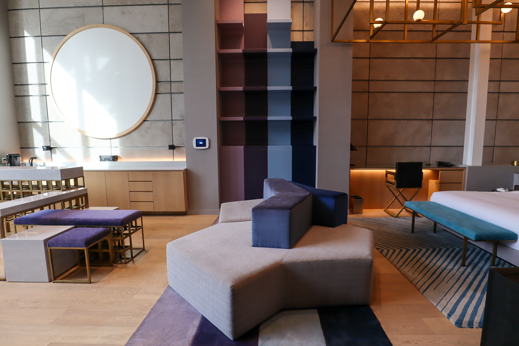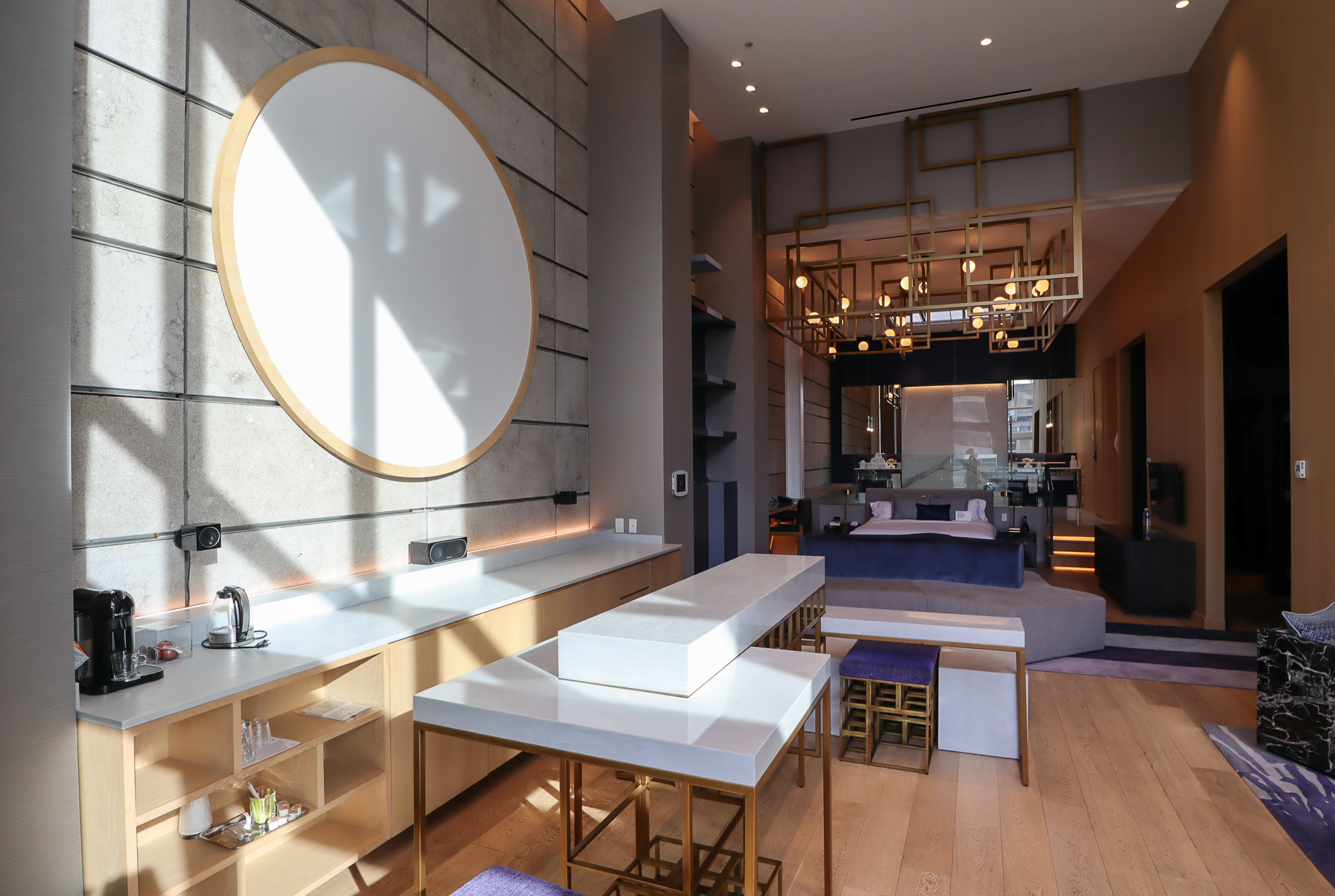 The “bedroom” is truly a wonderful sight to behold. The king bed is adorned overhead with what’s easily the most striking architectural feature of the suite: a massive complex of golden interlocking light fixtures, inspired by – you guessed it – one of Montreal’s most recognizable buildings in Habitat 67.
