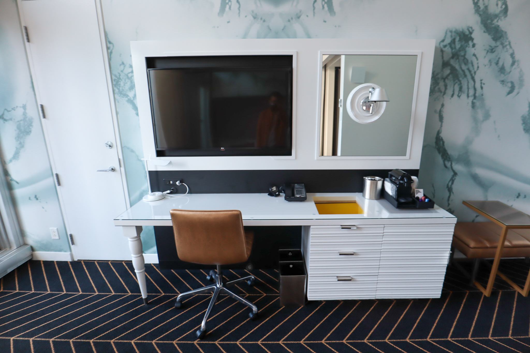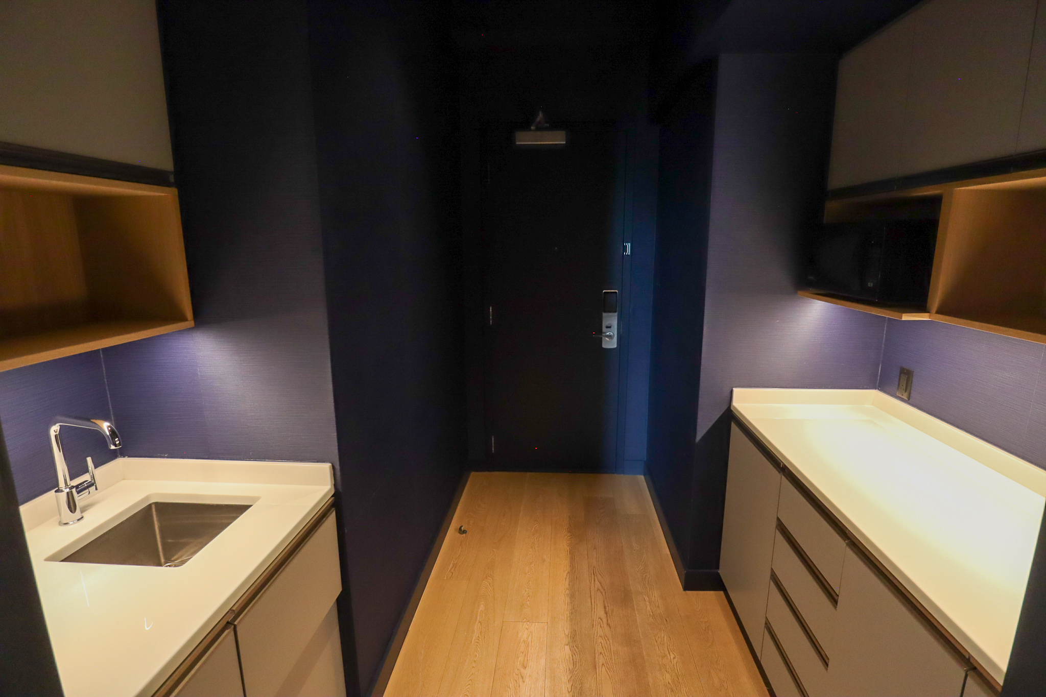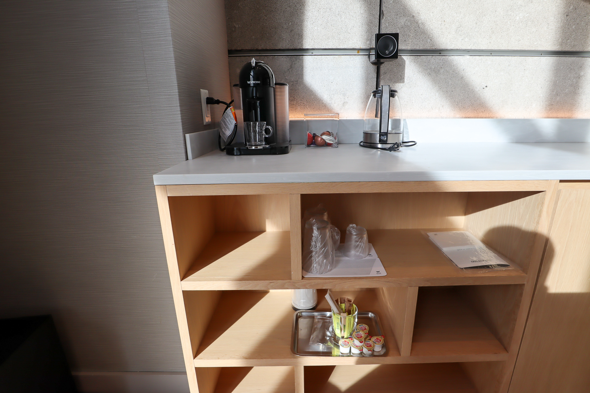 The countertop here also served as the suite’s pantry, playing host to a Nespresso machine, a kettle, and a series of cabinets containing far more storage space than we needed for our one-night staycation.