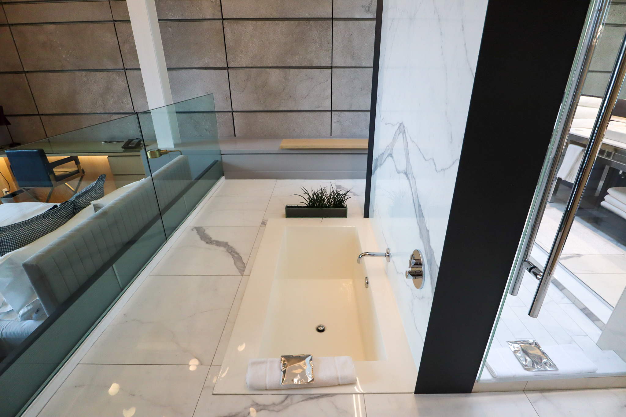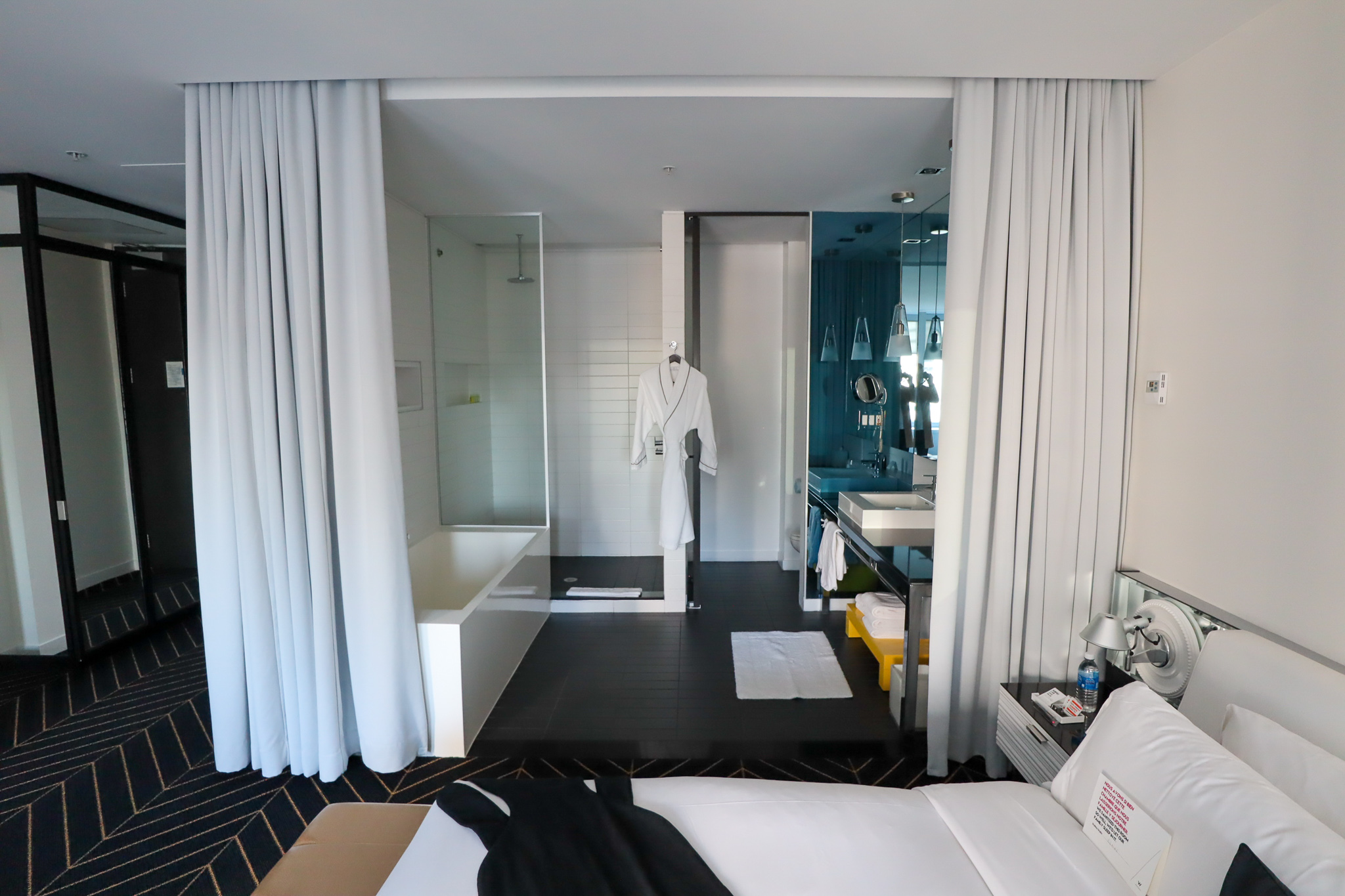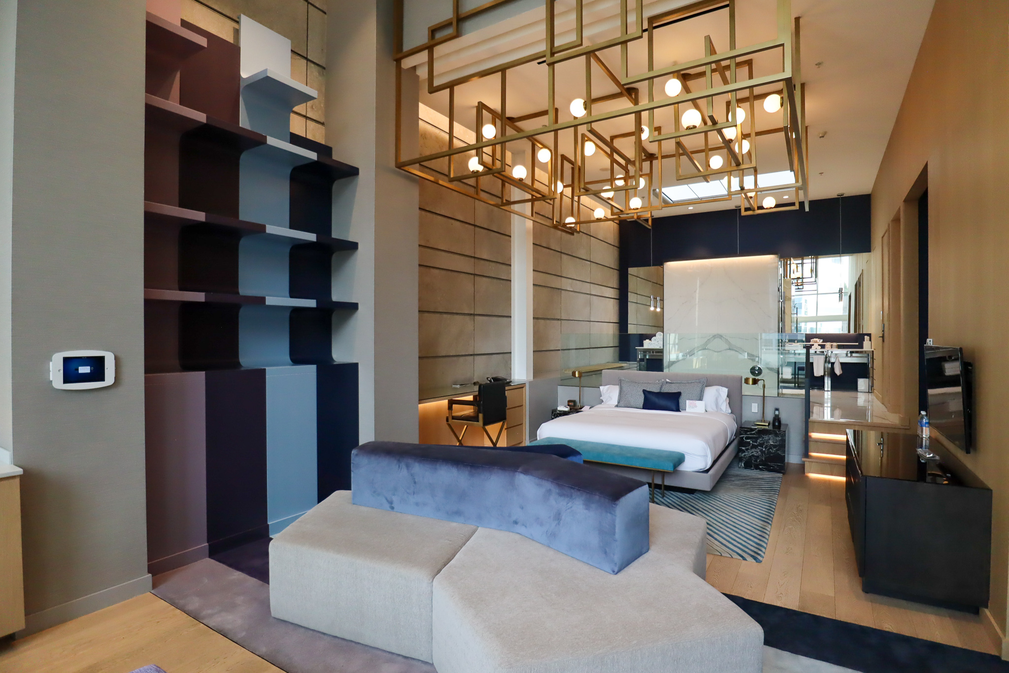 For now, let’s swivel around and head towards the bedroom and bathroom on the opposite end of the Extreme WOW Suite – although neither can really be described as “rooms” given how open-concept everything is.