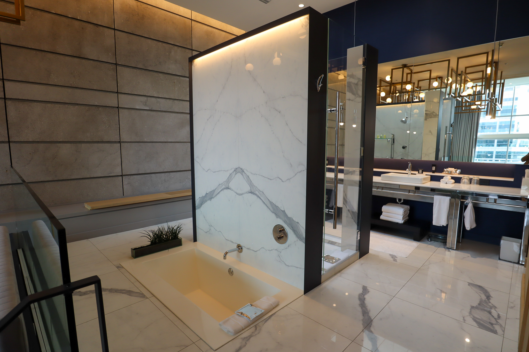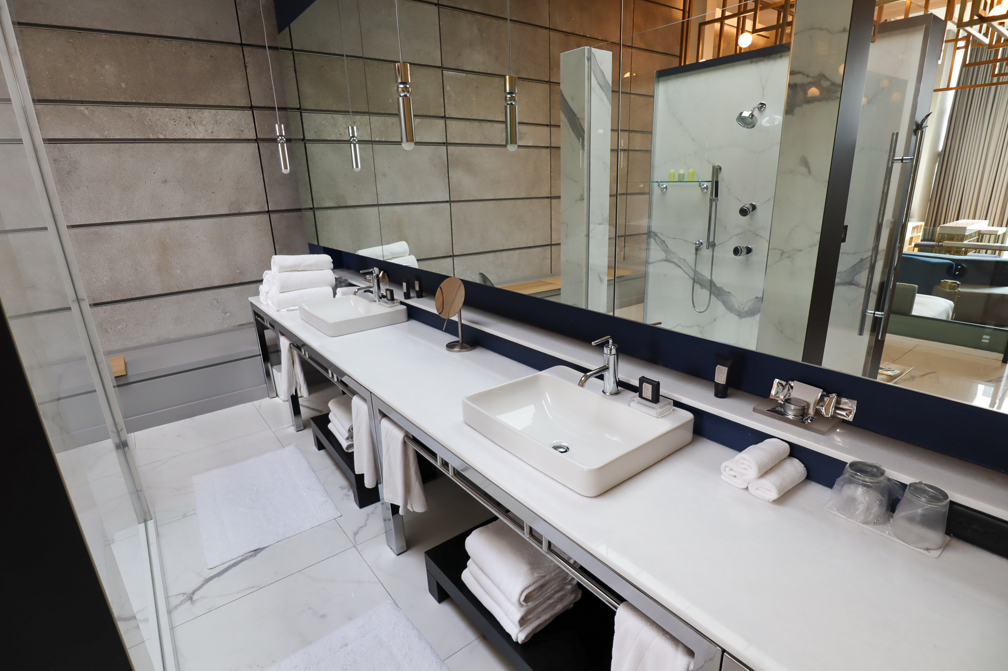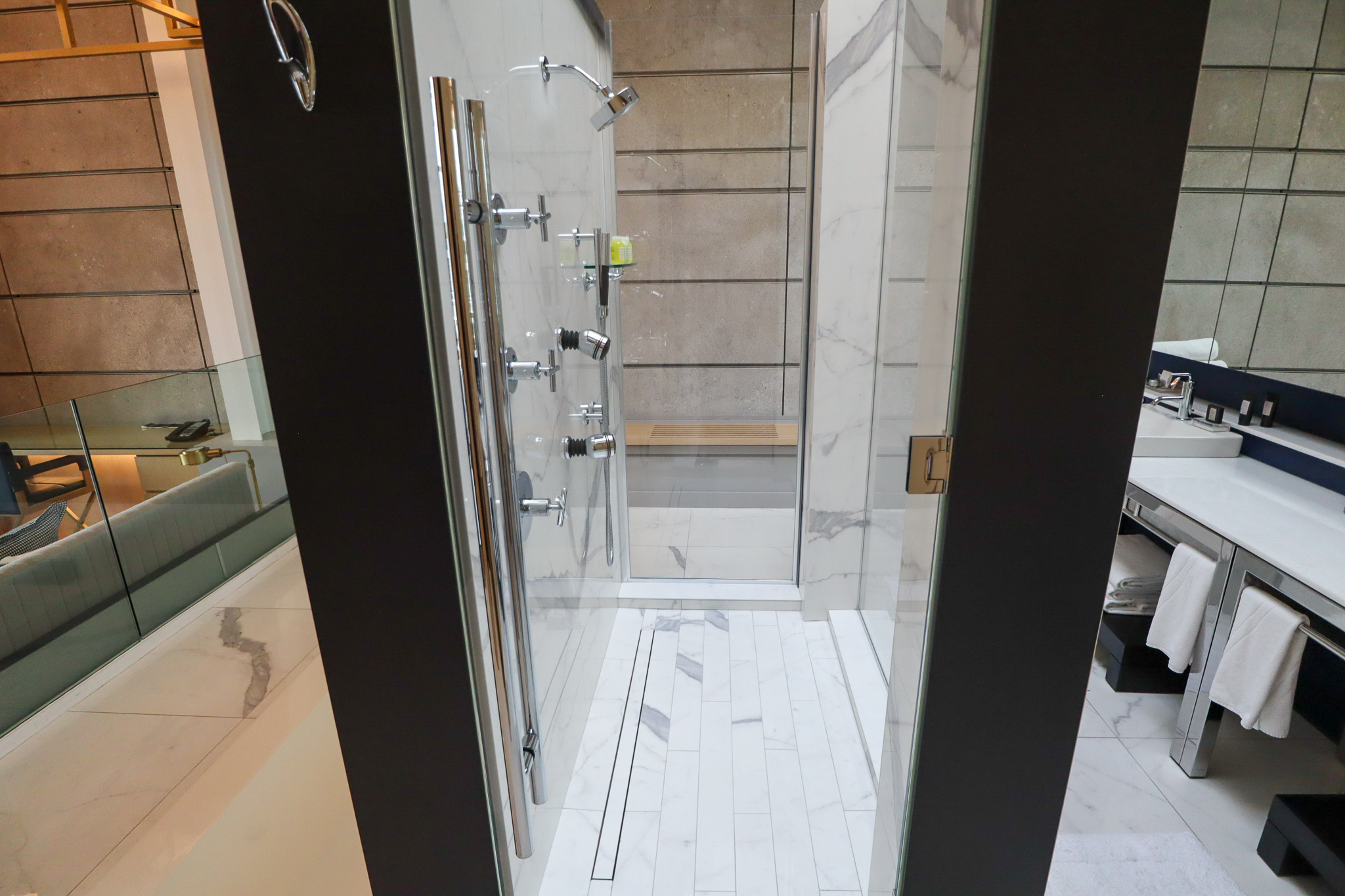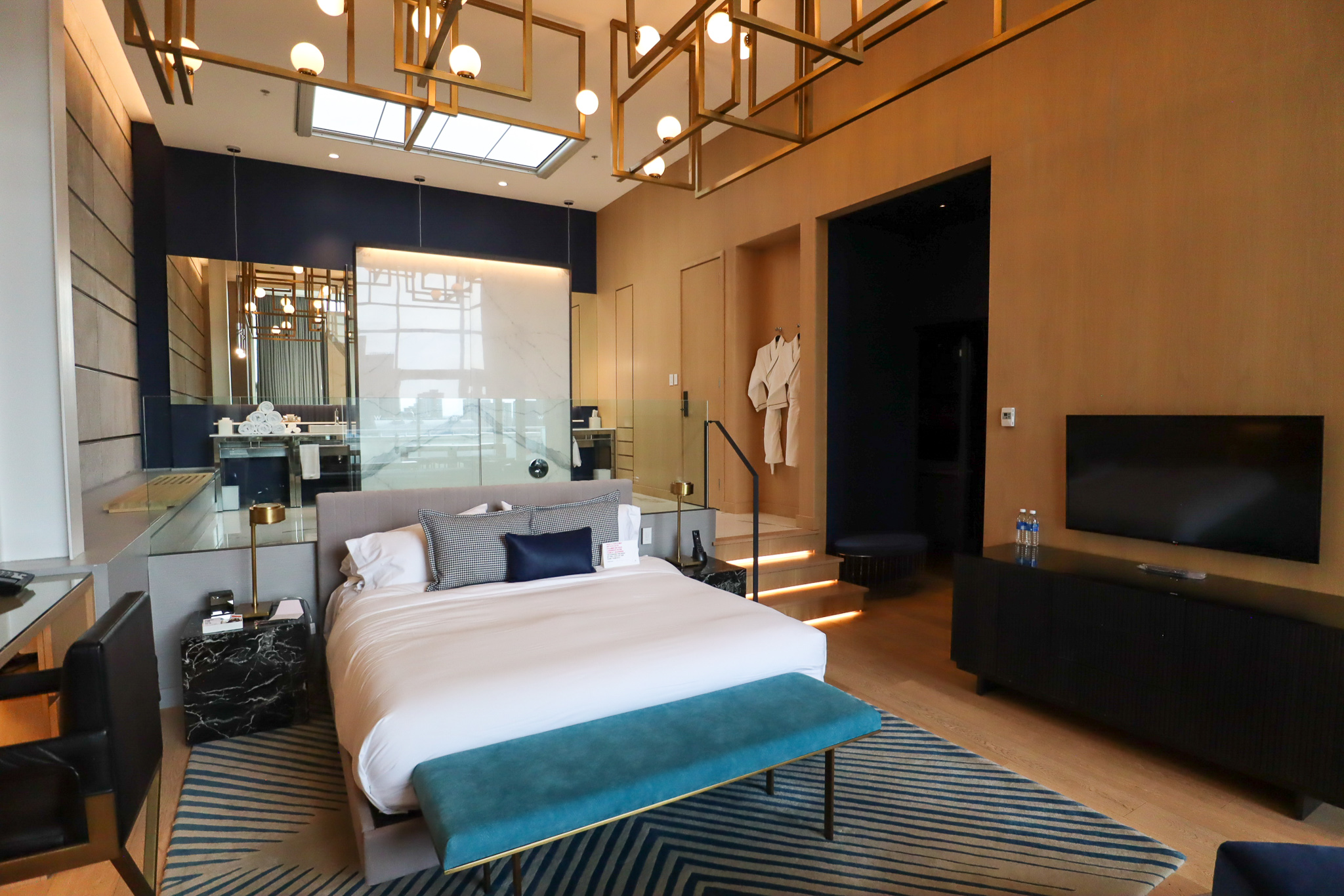 For now, let’s swivel around and head towards the bedroom and bathroom on the opposite end of the Extreme WOW Suite – although neither can really be described as “rooms” given how open-concept everything is.